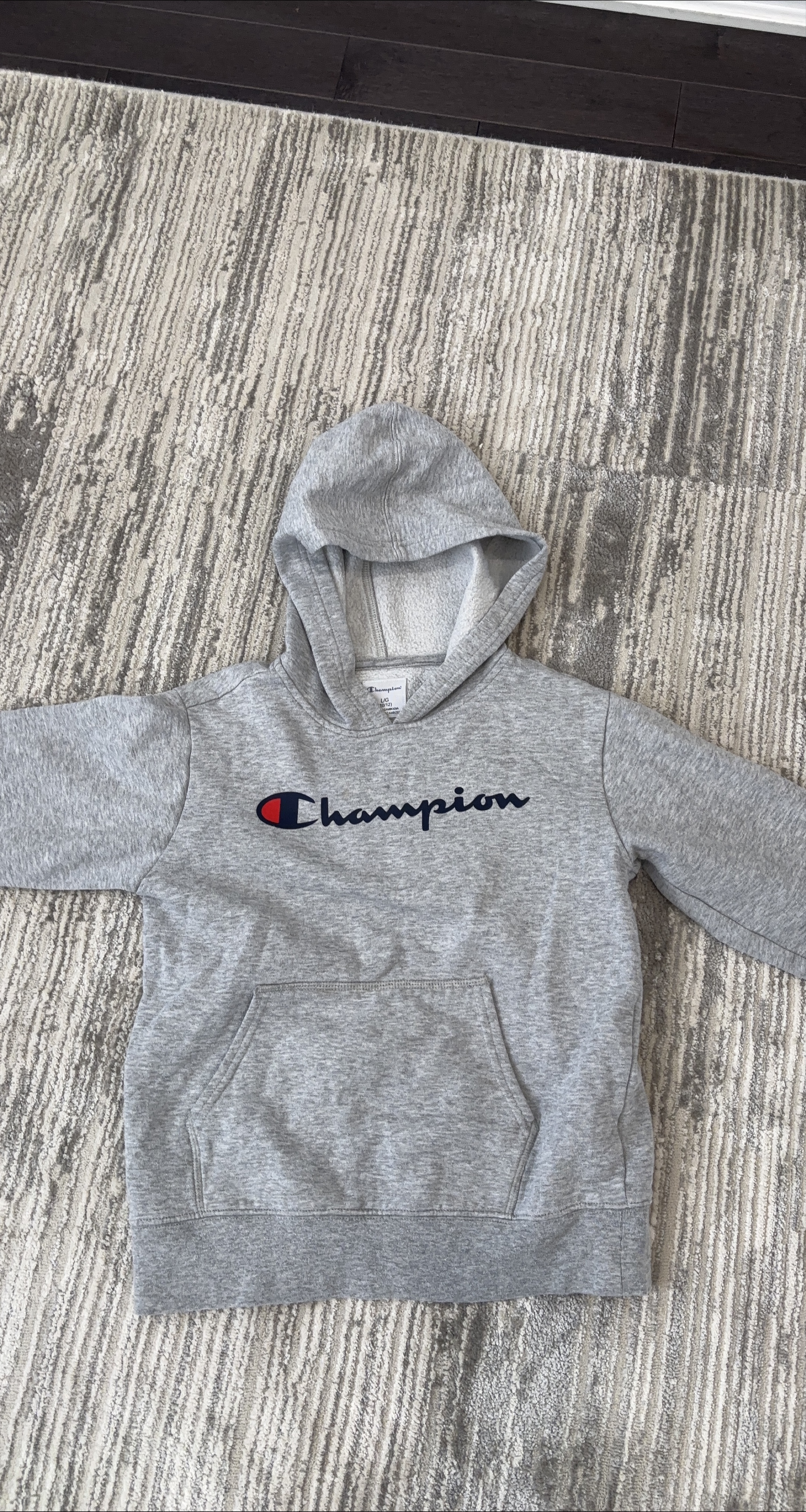 Selling a Champion kids grey hoodie in size L (10/12). It's in great condition and ready for a new home! Perfect for keeping your little one warm and stylish.