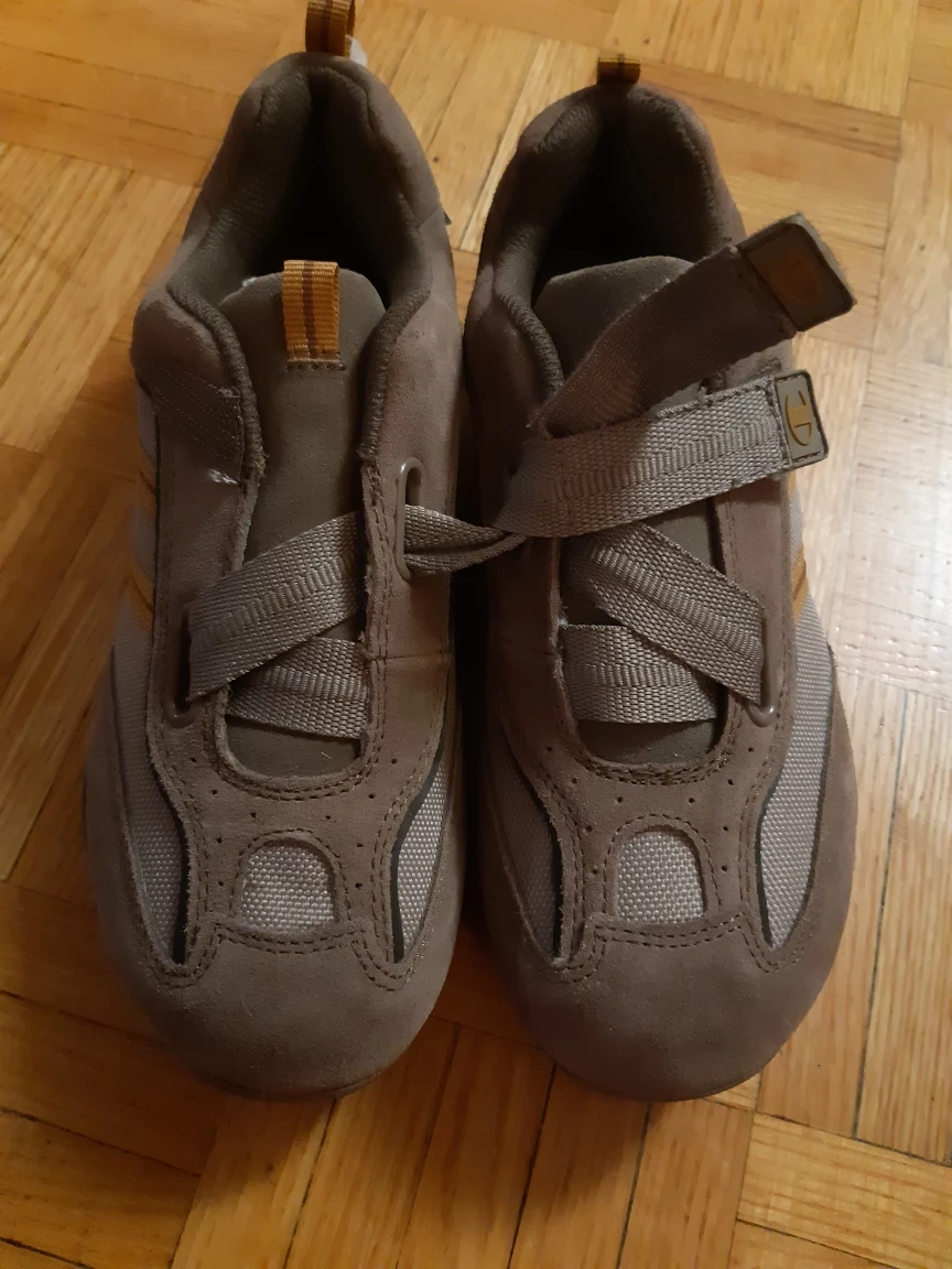 Here are some brand new Champion sneakers made with leather and man-made materials. They are a size 4.5 (youth). They have a neutral, earthy tone, perfect for casual wear.