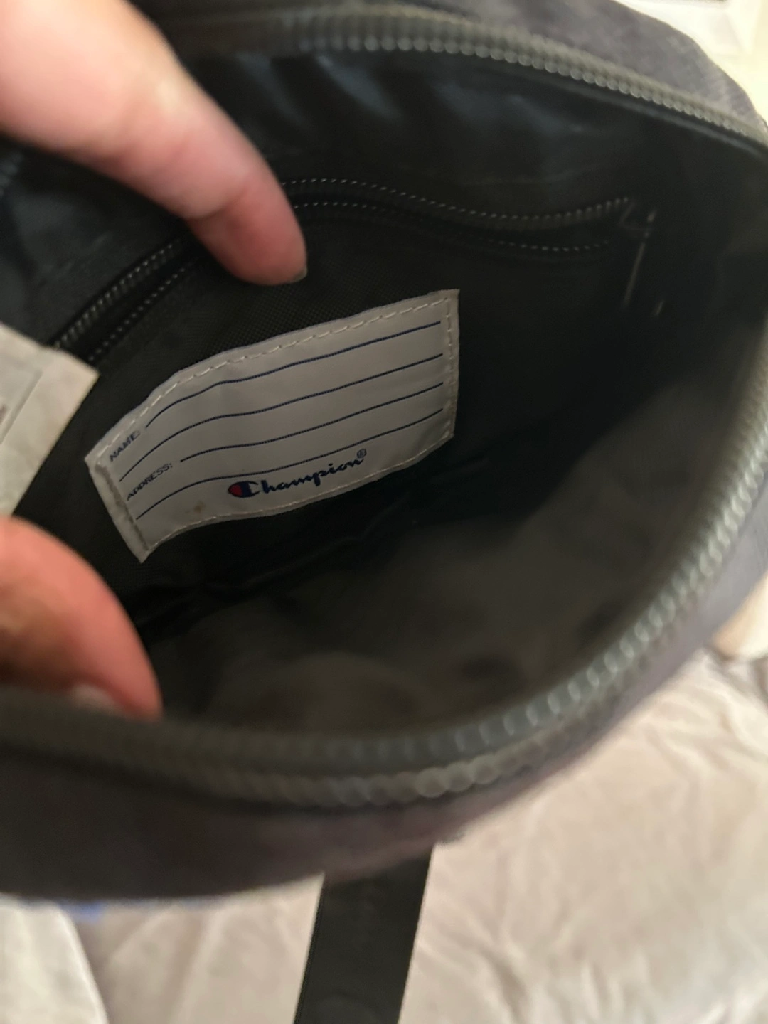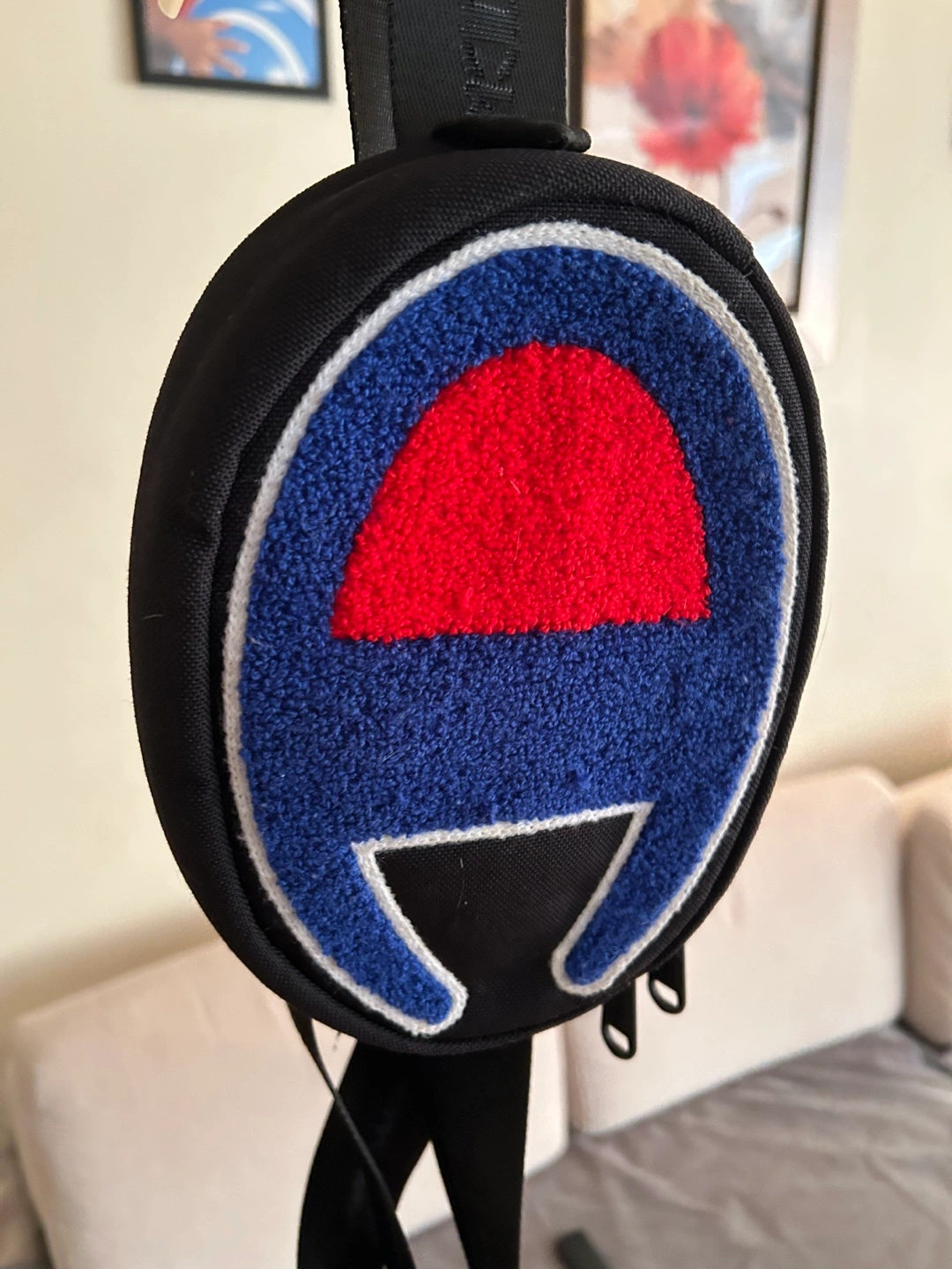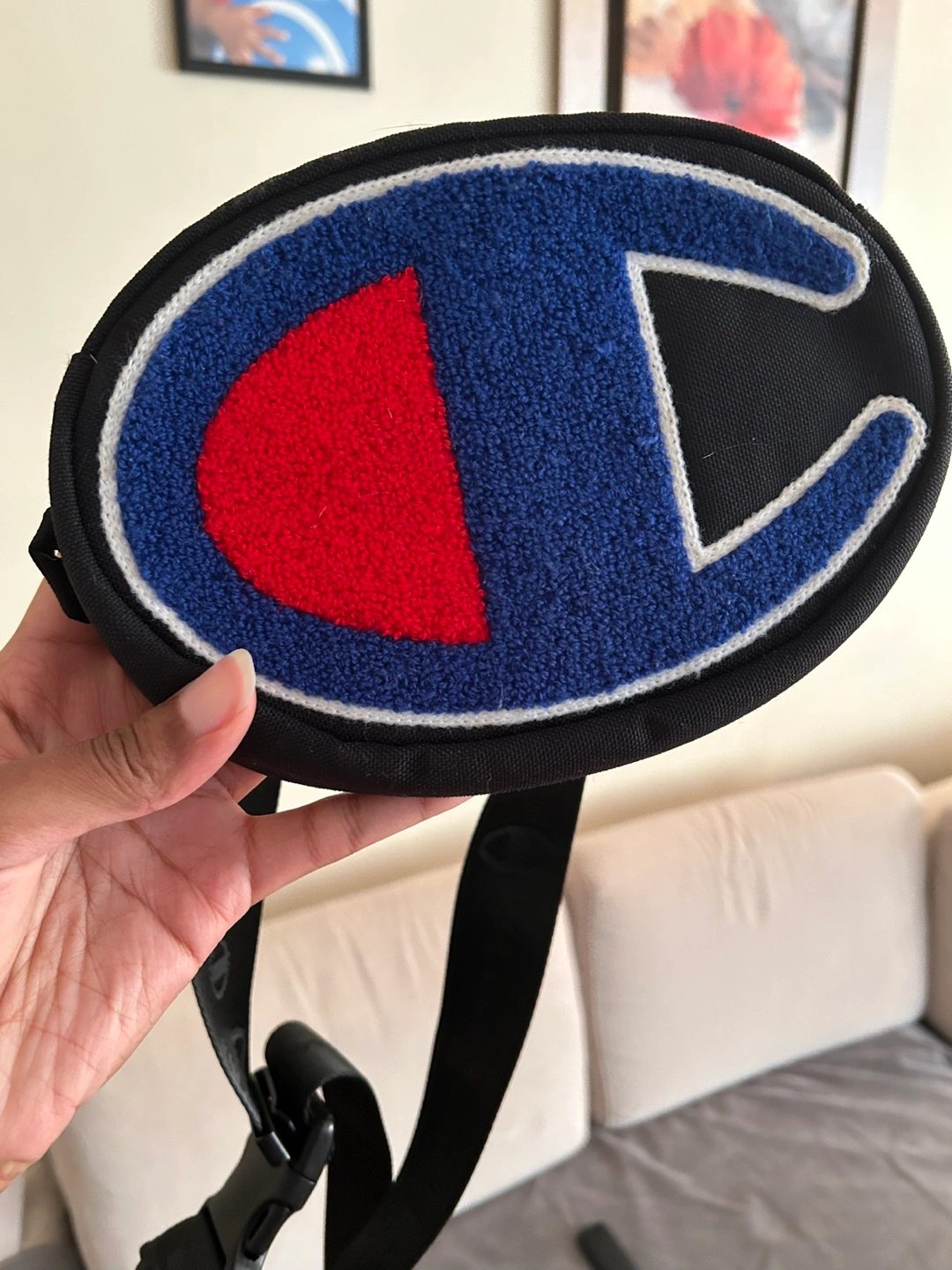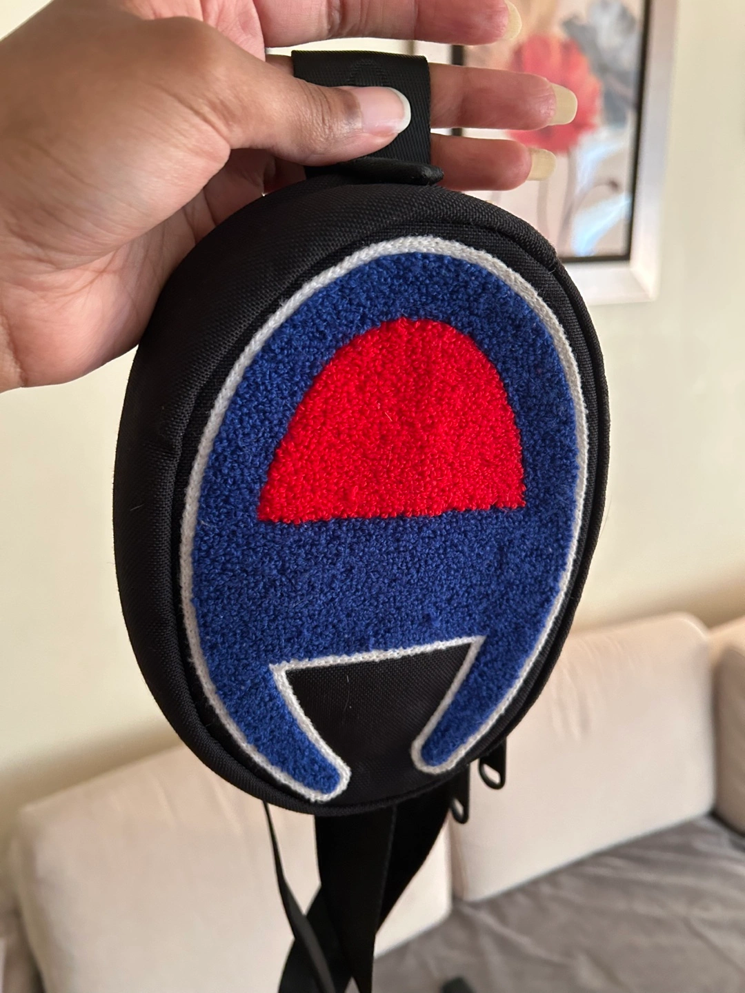 Small black Champion waist bag. Features a large embroidered logo. Adjustable strap. One main compartment and small zipper pocket inside. Barely used and in great condition
