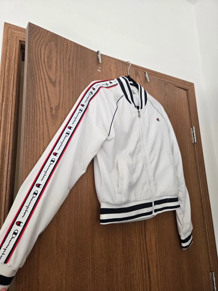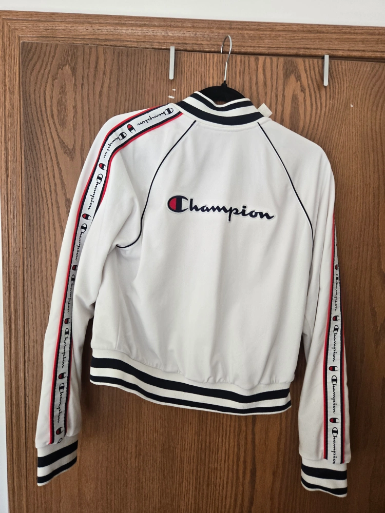 Lightweight cropped bomber jacket. Features a zip closure, ribbed cuffs and hem, and Champion branding on sleeves and chest. Great for layering or wearing on its own.