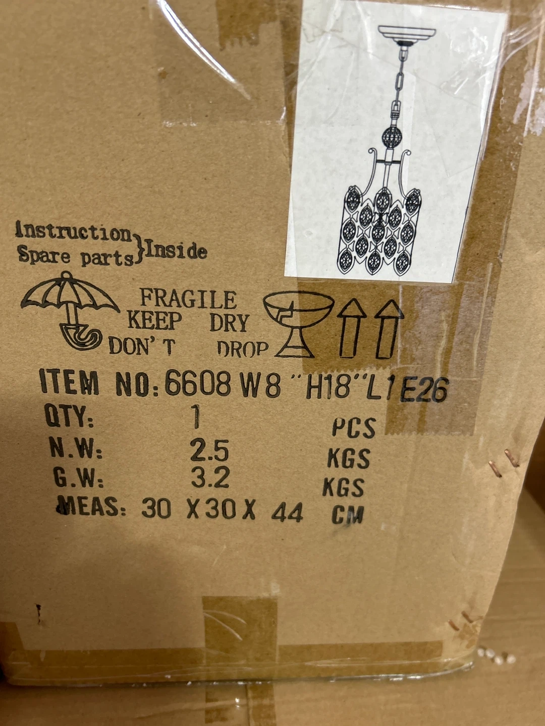 Selling a chandelier, still in its original box! The box includes instructions and spare parts. The dimensions of the box are 30 x 30 x 44 cm.