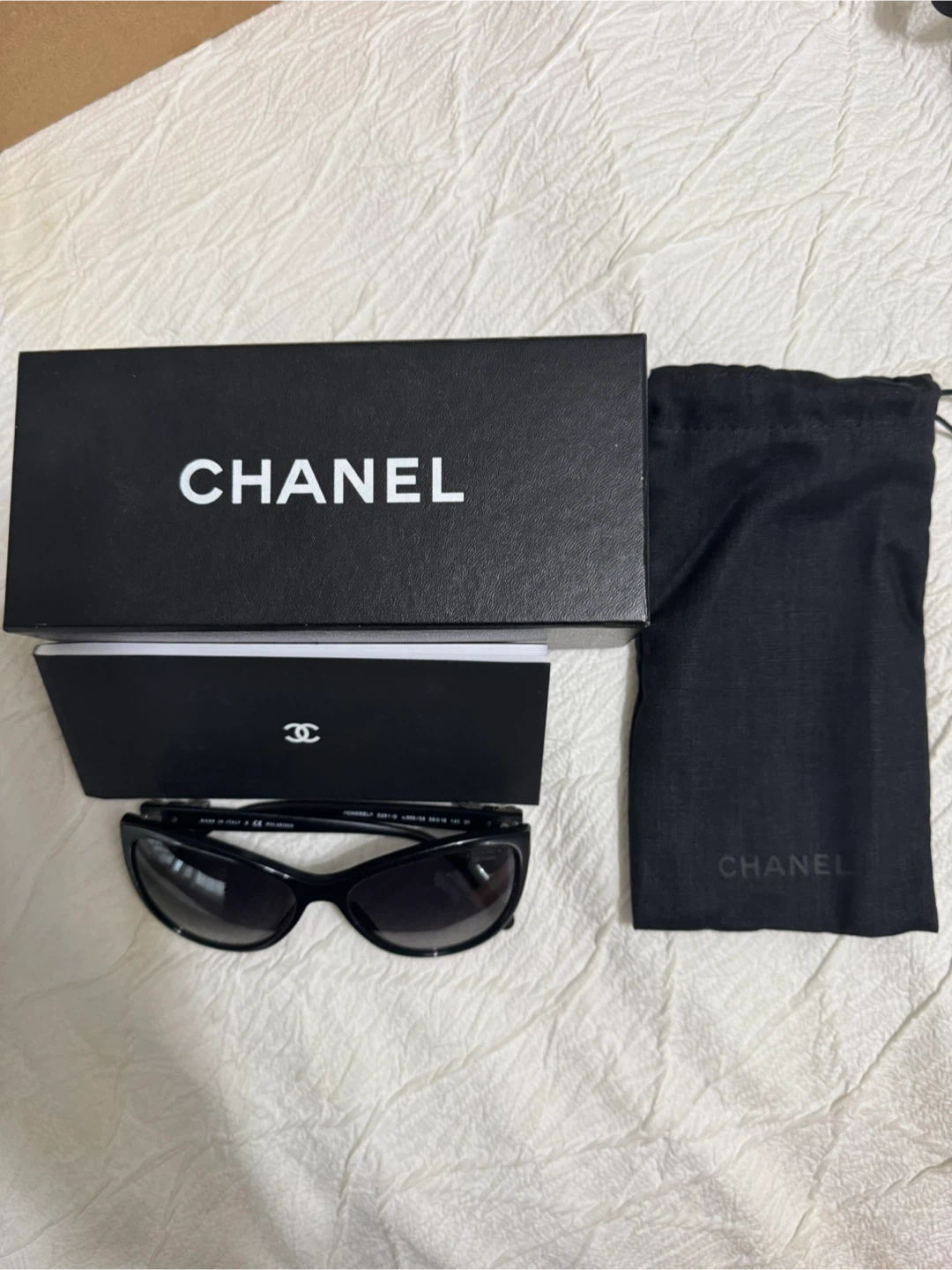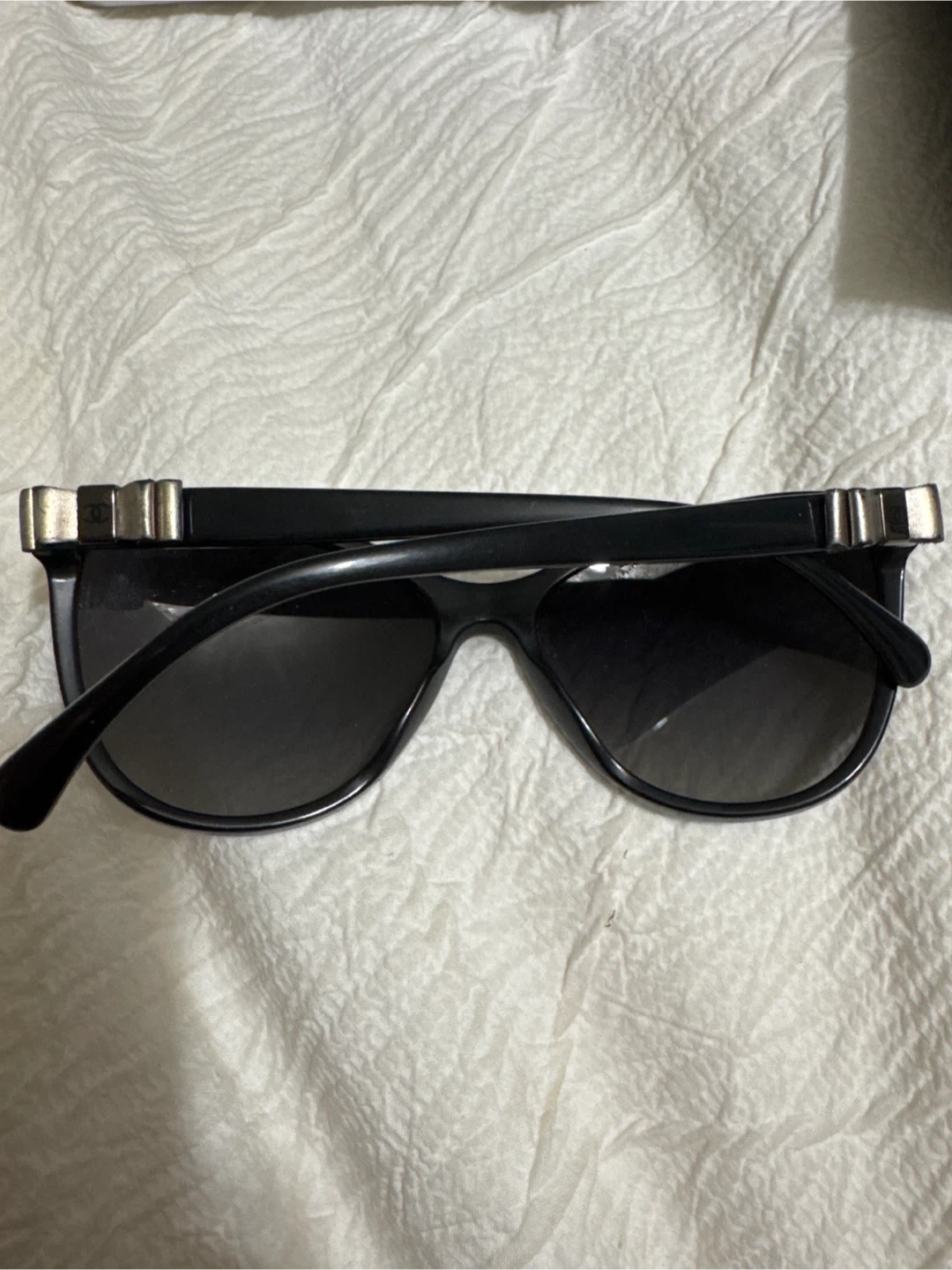 Selling a pair of Chanel 5281-Q. They come with the original box and a dust bag. The sunglasses are black and feature the Chanel logo on the side with black leather bows. The size is 58-16 140 3P.