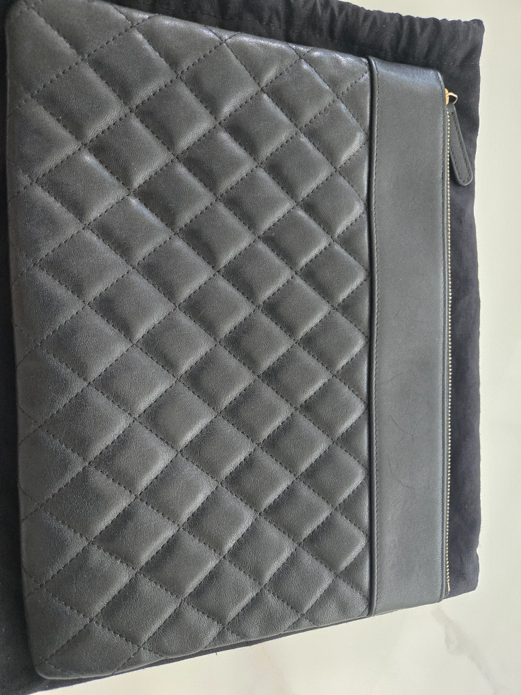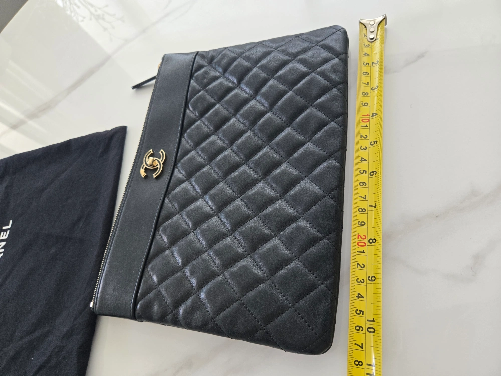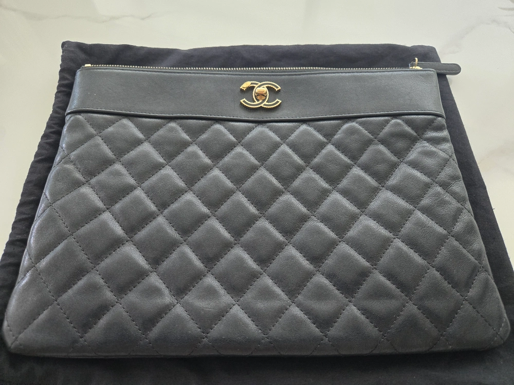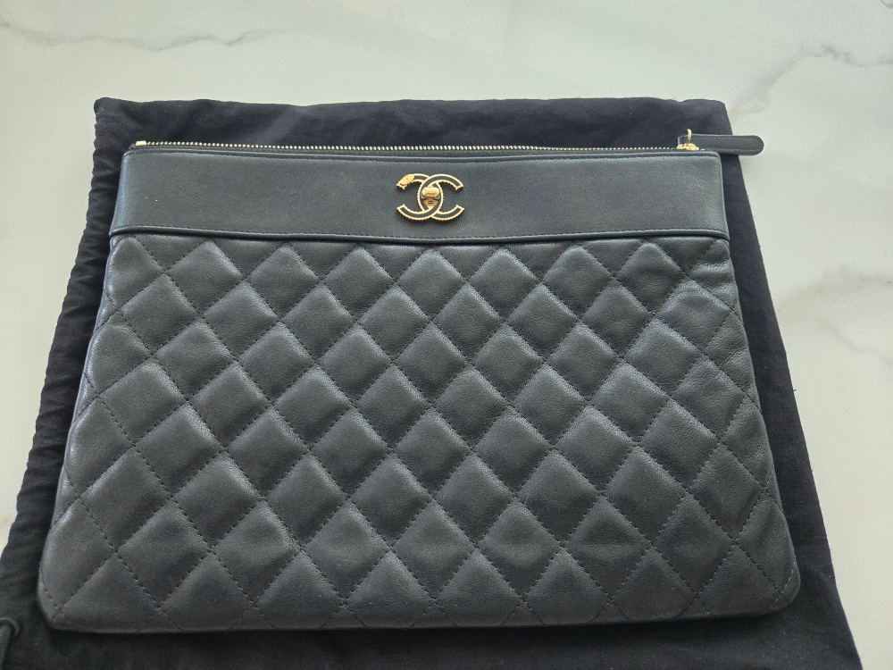 Selling a beautiful Chanel clutch in black quilted leather. It's in good condition and comes with a dust bag and authentification card. Perfect for carrying your essentials in style! purchased from Chanel Boutique in Beverley hills couple years ago.