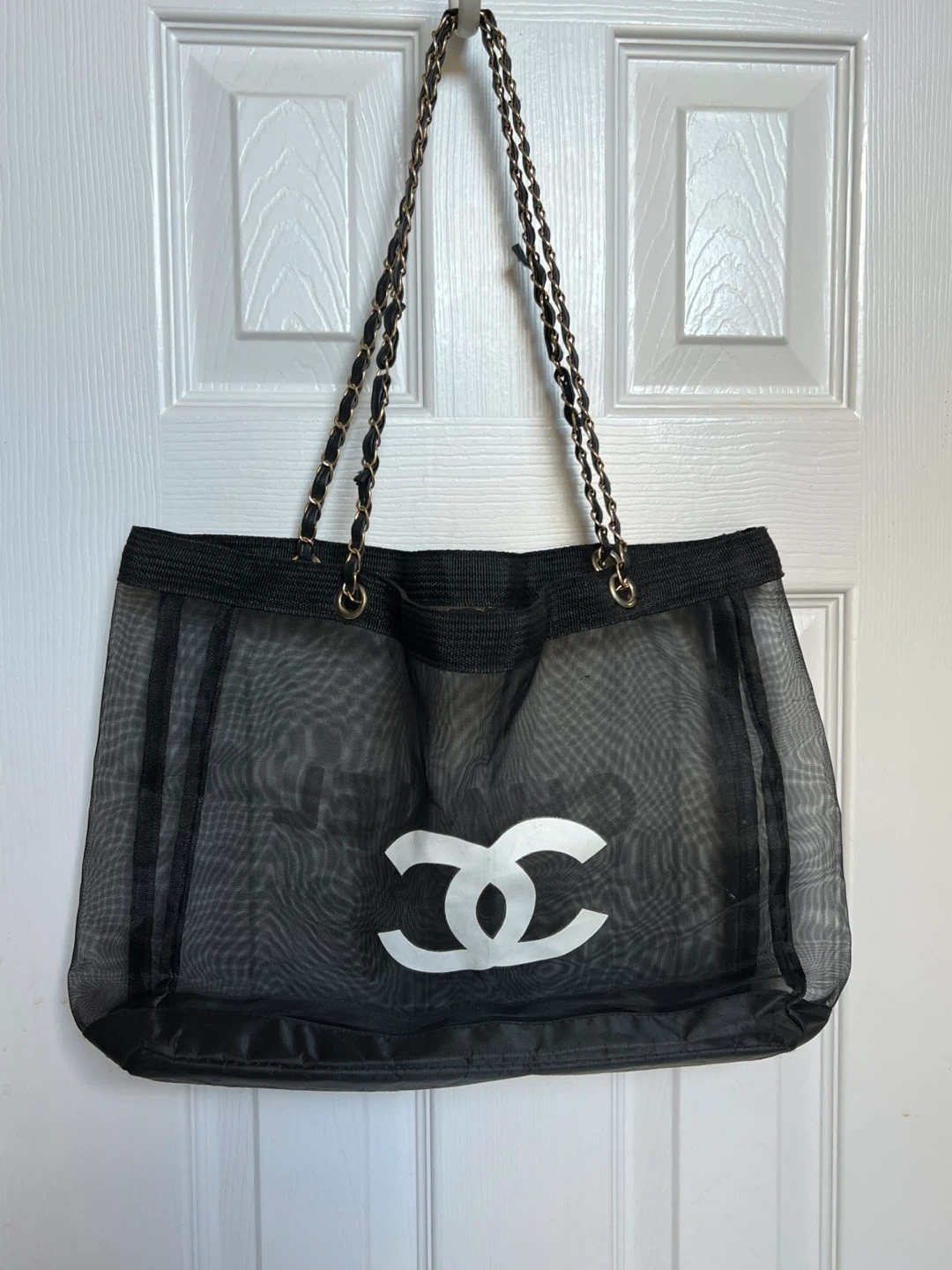 Selling a Chanel Paris black mesh tote bag! It's in great condition and ready for a new home. The bag features the classic Chanel logo and chain straps. Perfect for everyday use or a stylish beach bag!