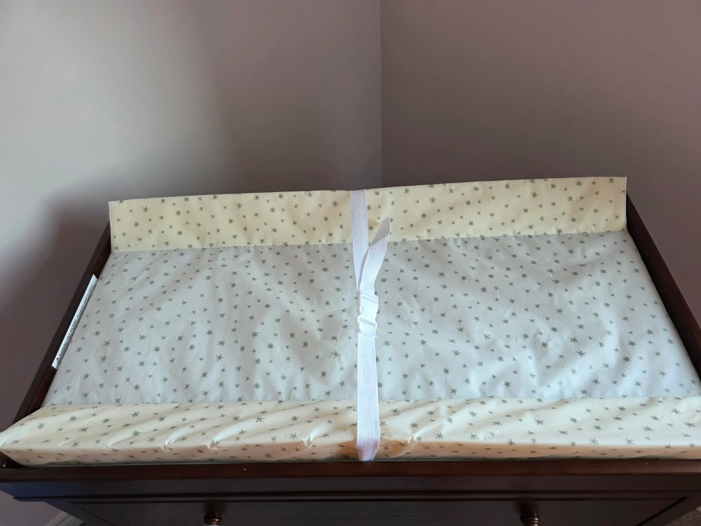 Changing table pad with a cute star pattern. It has a safety strap to keep baby secure. Great for any nursery!