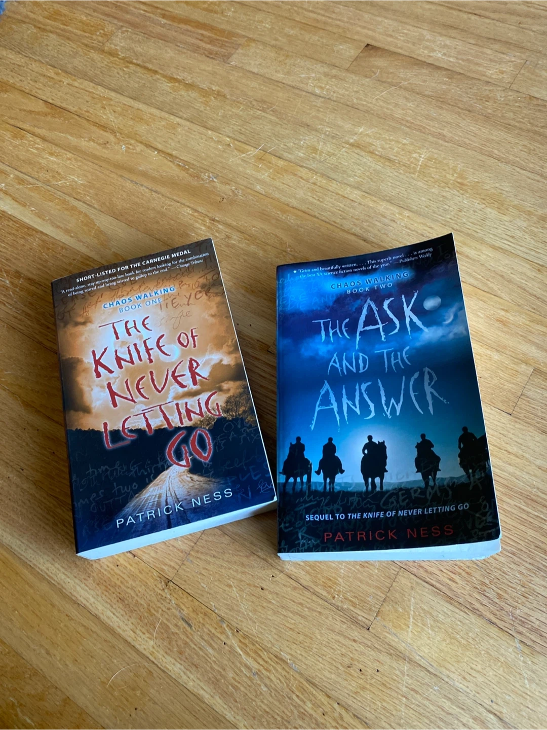 Selling the first two books in the Chaos Walking series by Patrick Ness: The Knife of Never Letting Go (Book One) and The Ask and the Answer (Book two) Book two is in a rough condition its optional Book one in great condition for $7