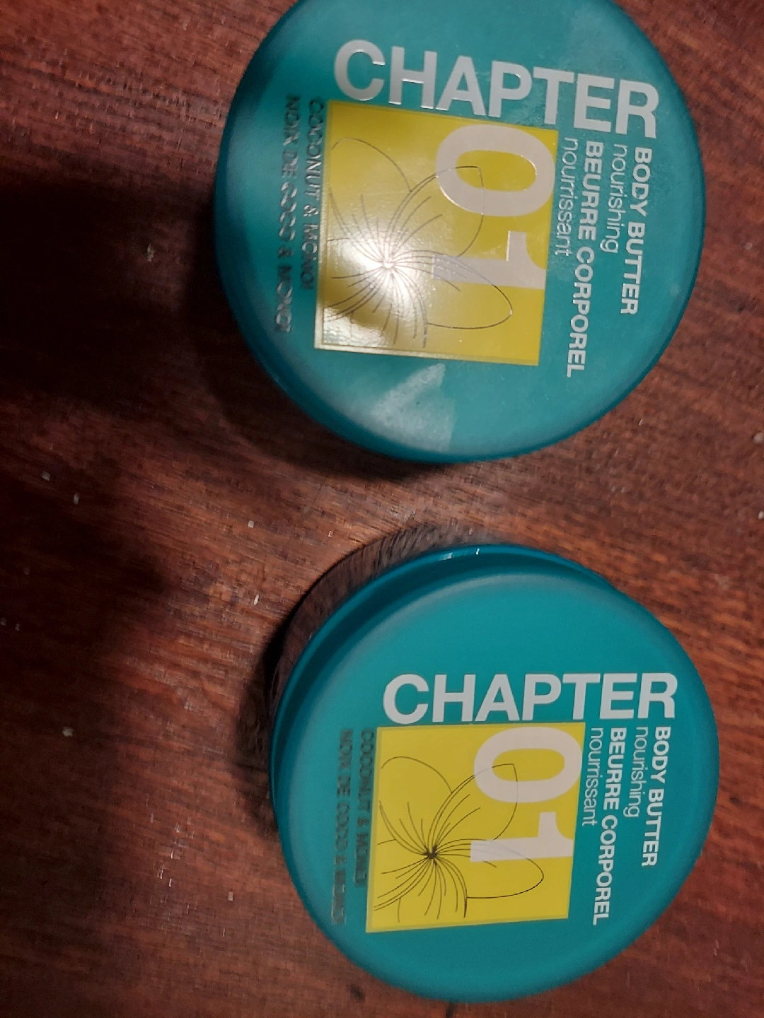 Selling two containers of Chapter 01 Body Butter. They are nourishing and contain coconut and monoi. One is labelled in English and the other is labelled in French