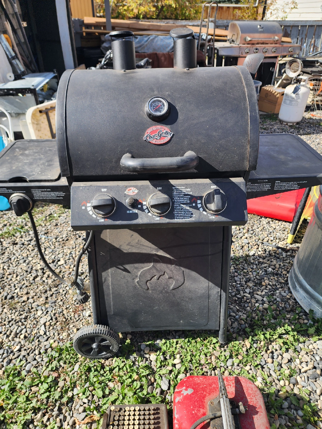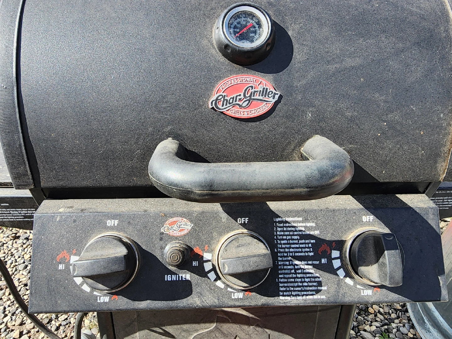 Selling a Char-Griller propane gas grill. It's in used condition, perfect for grilling season. Has three burners and an igniter. Ready for your next BBQ!