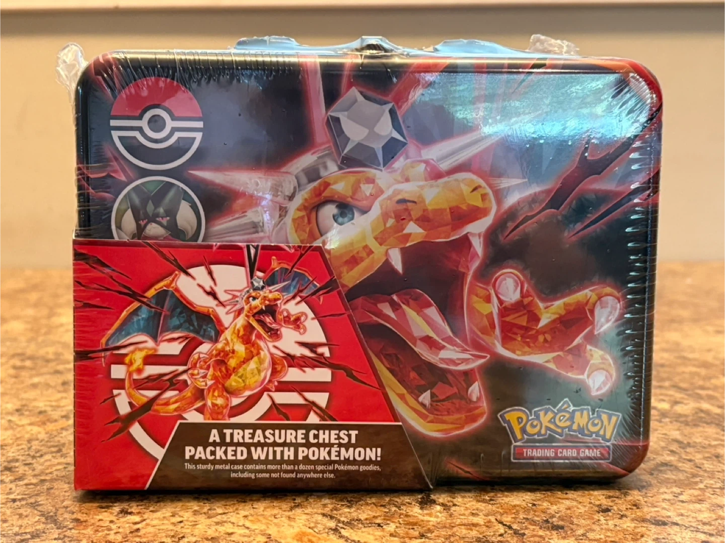 CHARIZARD COLLECTOR CHEST FALL 2023 FACTORY SEALED EXCELLENT CONDITION Chest includes: - 6 Pokemon TCG booster packs - 3 Foil cards featuring Meowscarada, Skeledirge, and Quaquaval - 1 Cool Pokemon coin - 4 Colorful sticker sheets - 1 Mini portfolio to store your favourite cards - 1 Code card for Pokemon TCG Live $80 CASH ONLY PPU