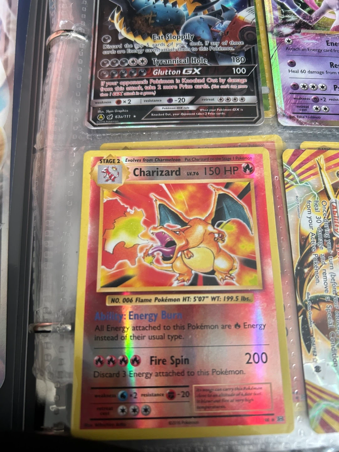 Selling a Charizard Pokemon card. It's a Stage 2 card that evolves from Charmeleon. It has 150 HP and the ability Energy Burn. The card also features the attack Fire Spin.