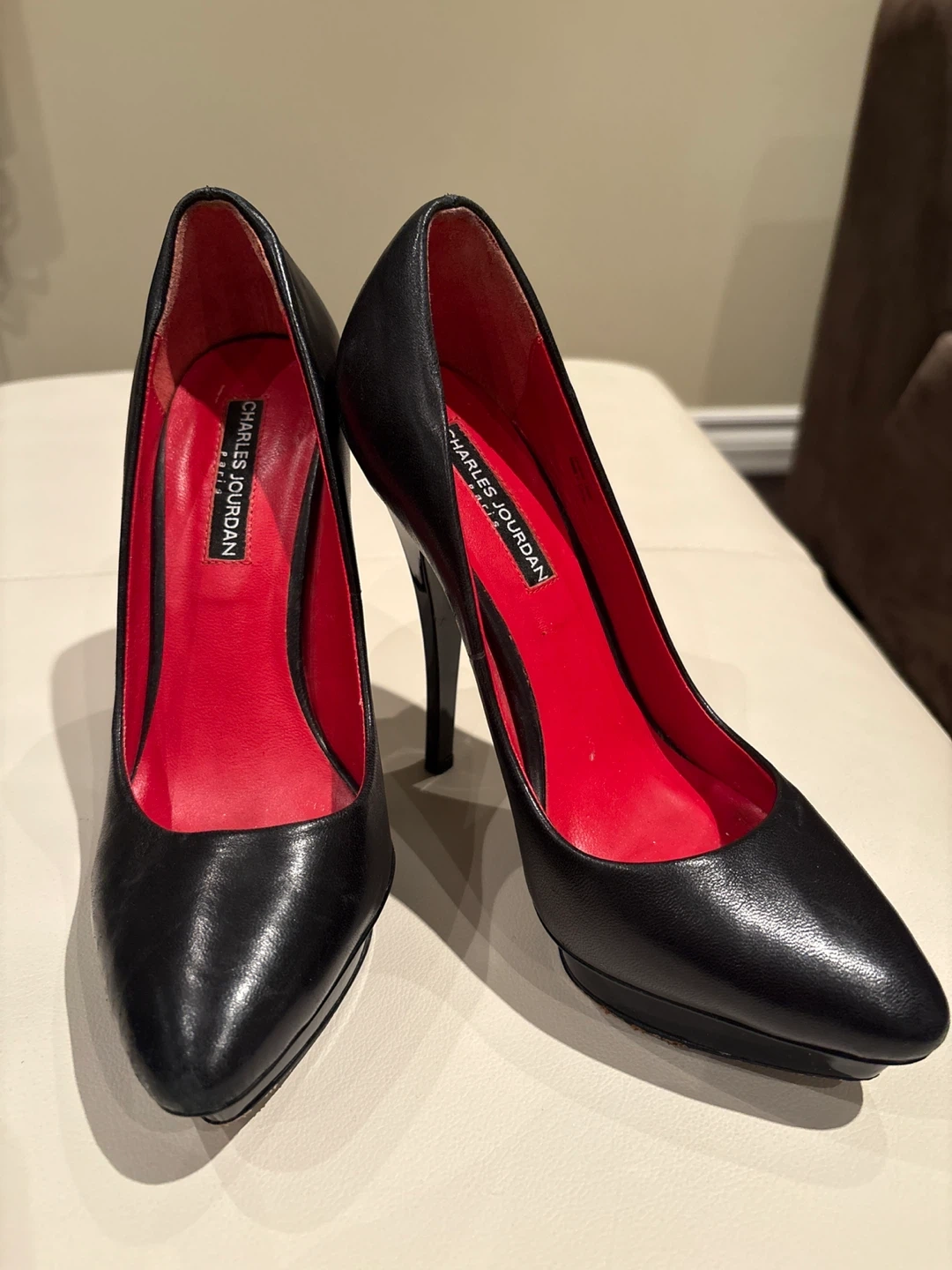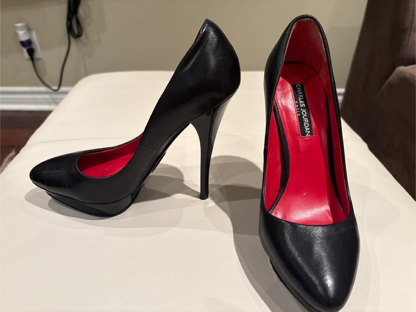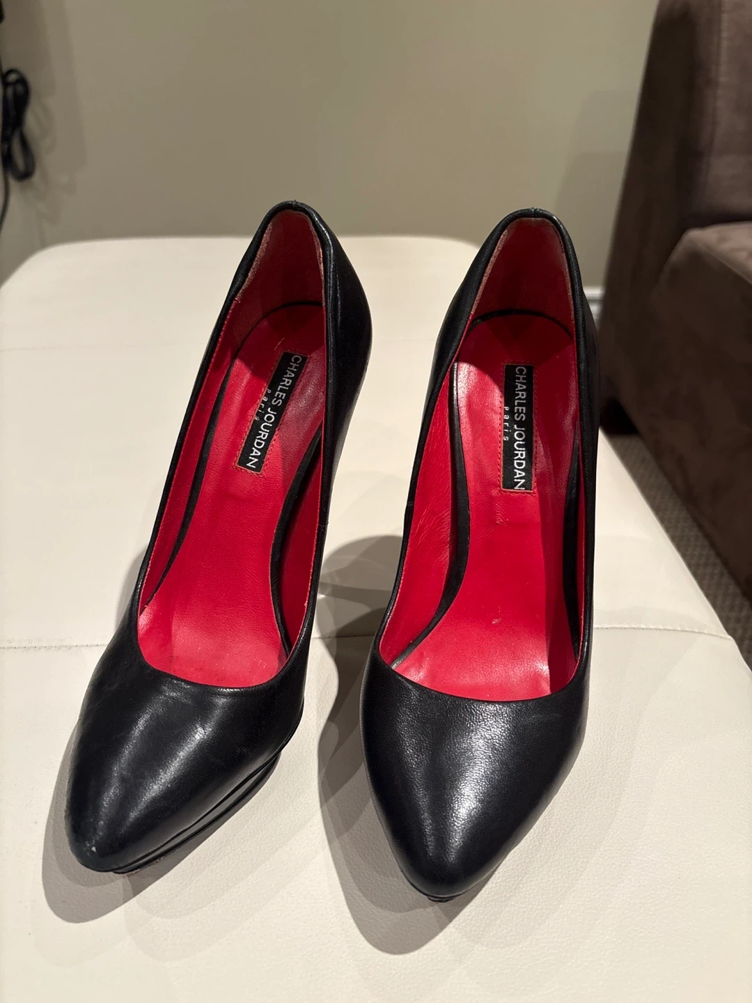 Classic black leather heels from Charles Jourdan! 6.5 but fits more like a 7. These stylish heels feature a vibrant red interior. Perfect for adding a touch of elegance to any outfit.