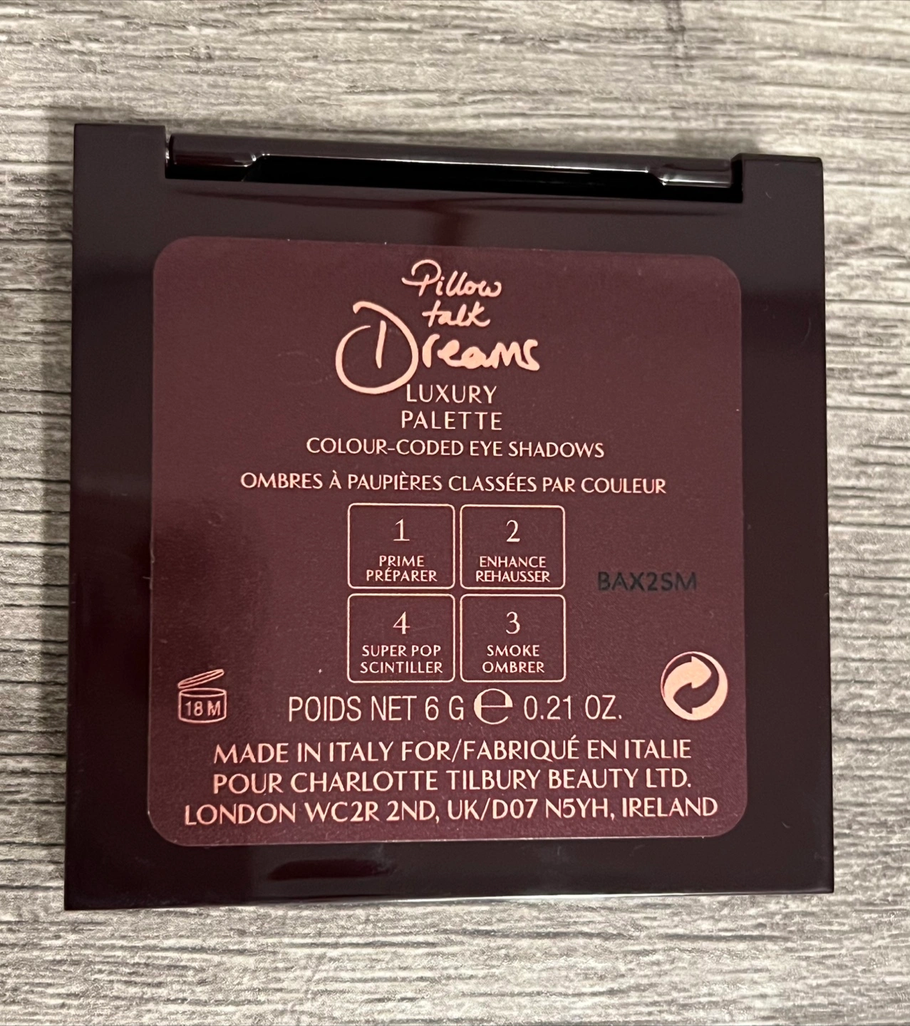 Selling a Charlotte Tilbury Pillow Talk Dreams Luxury Palette! It's a colour-coded eyeshadow palette with four shades to create a dreamy eye look. The palette includes a prime, enhance, smoke, and super pop shimmer. Perfect for adding a touch of luxury to your makeup collection!