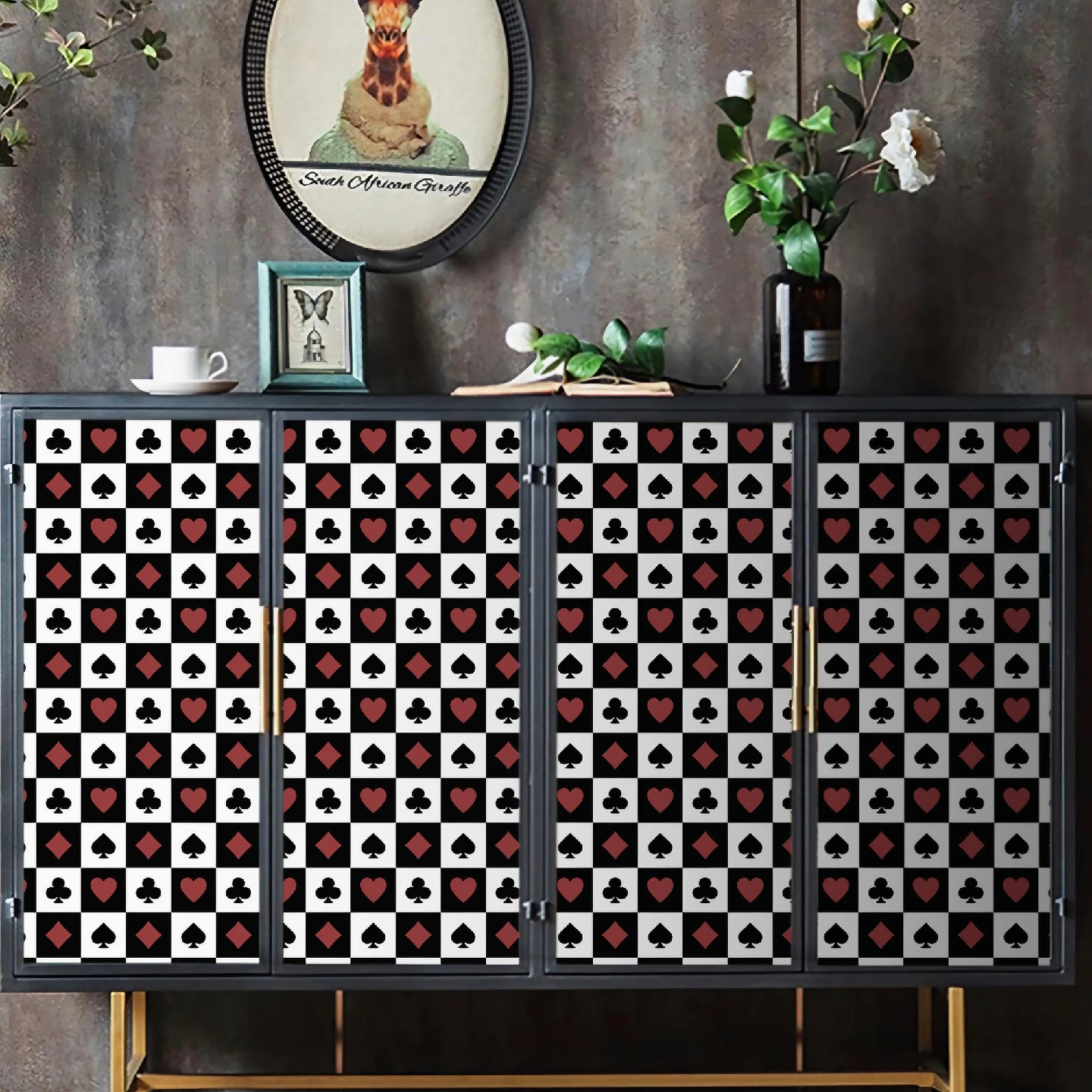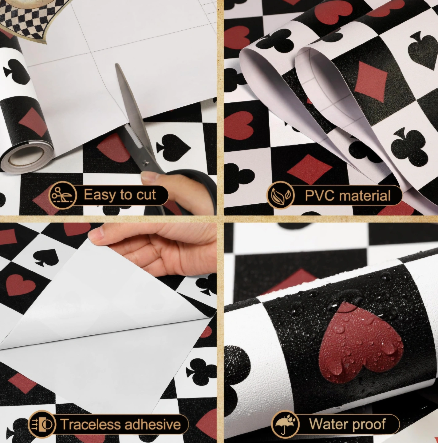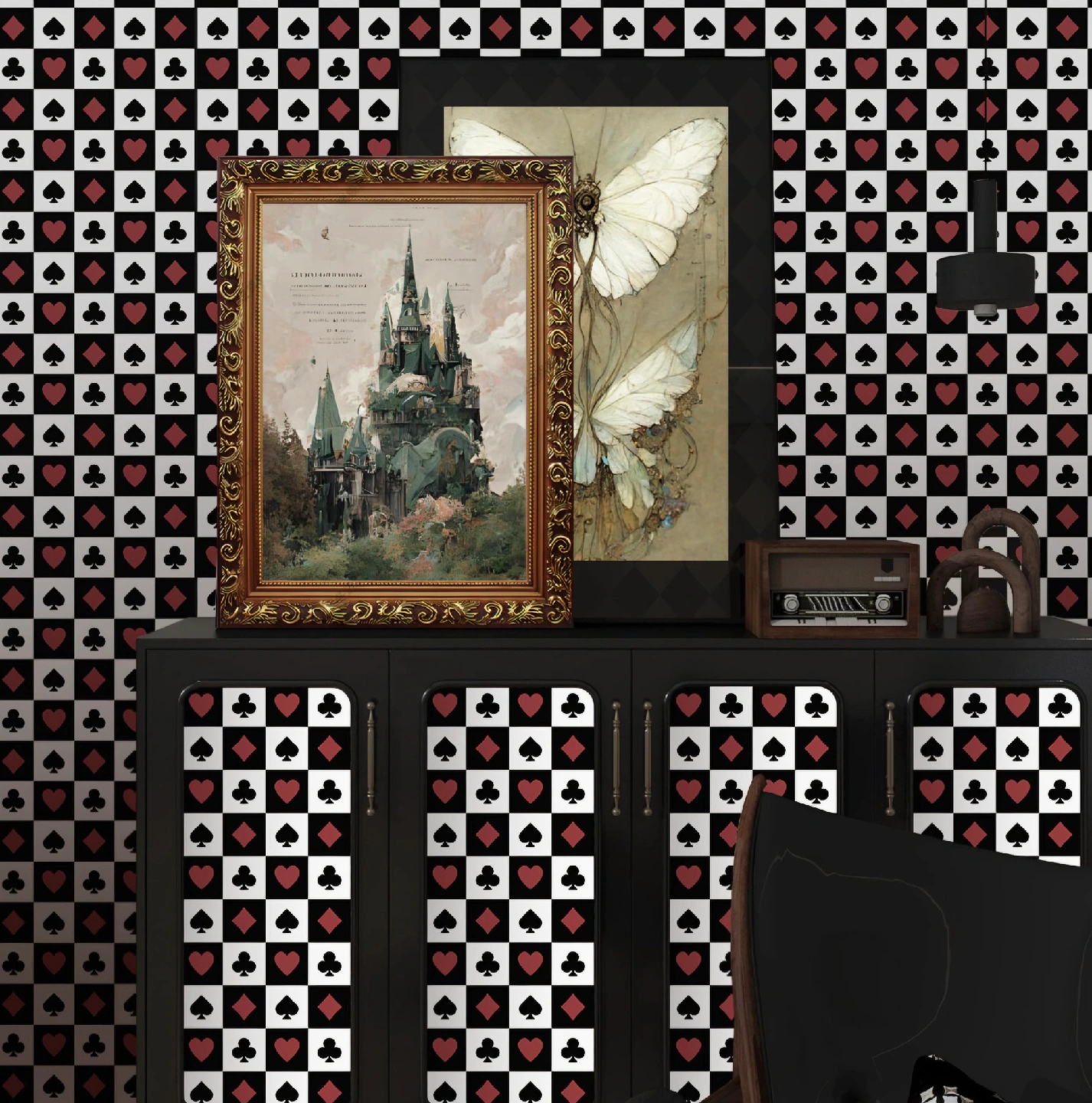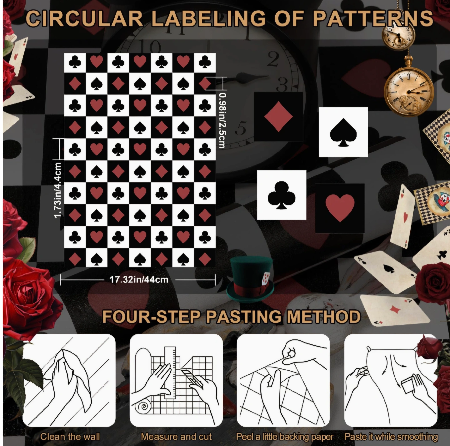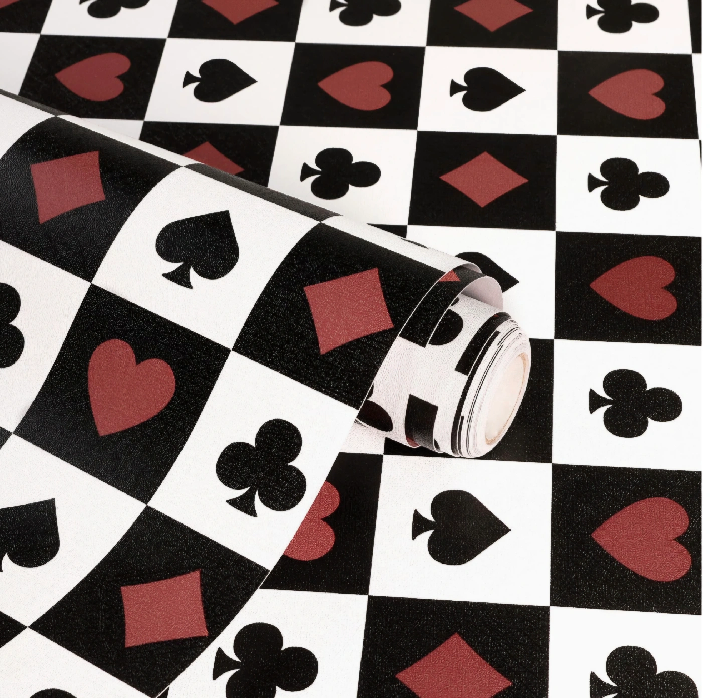 Add some fun to your space with this playing card themed wallpaper! It features a pattern of spades, hearts, clubs, and diamonds. 17.3"x160"