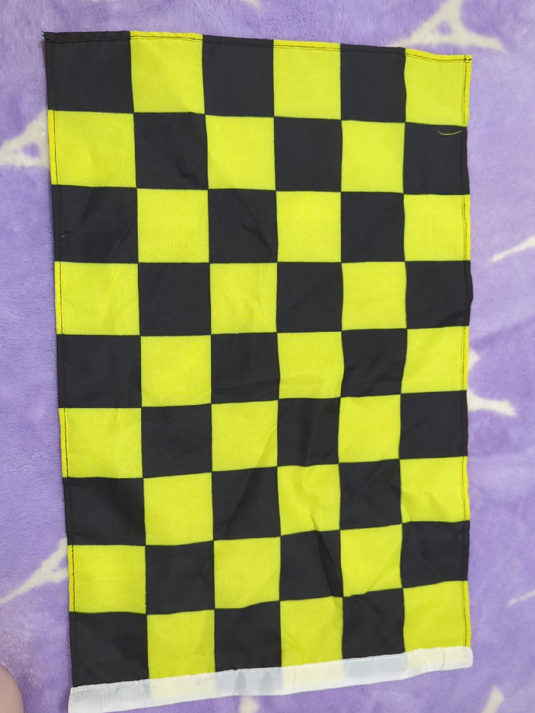 Selling a checkered racing flag in black and yellow.