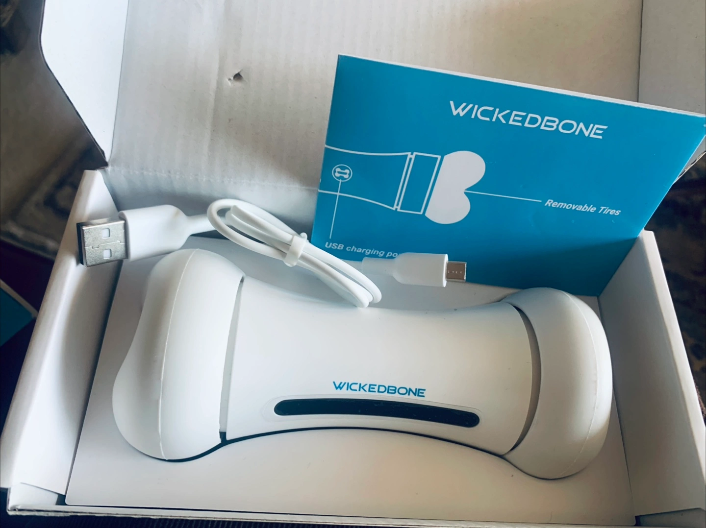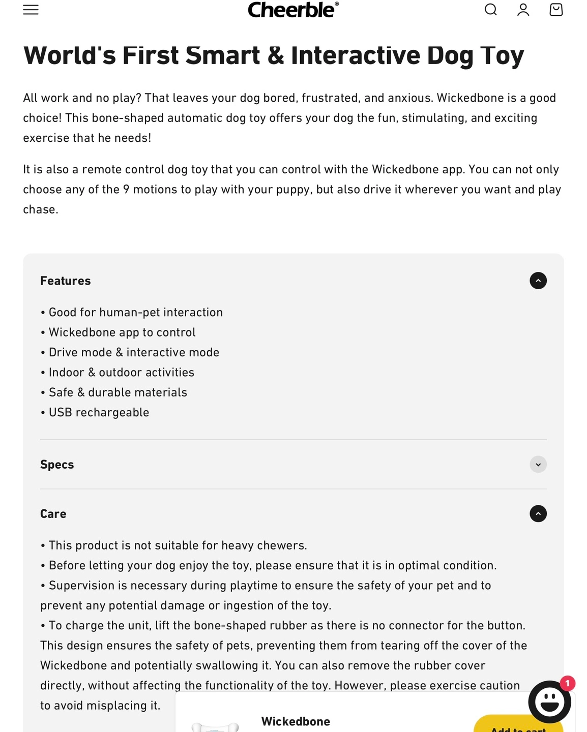 Selling a brand new Cheerble Wickedbone, the smart and interactive dog toy! It's designed to keep your furry friend entertained with both drive and interactive modes. - Control it through the Wickedbone App for virtual joystick fun - Features 9 available motions and new action combos - Programmed to attract your dog's attention - USB rechargeable Comes with the original box, USB charging cable, and instructions