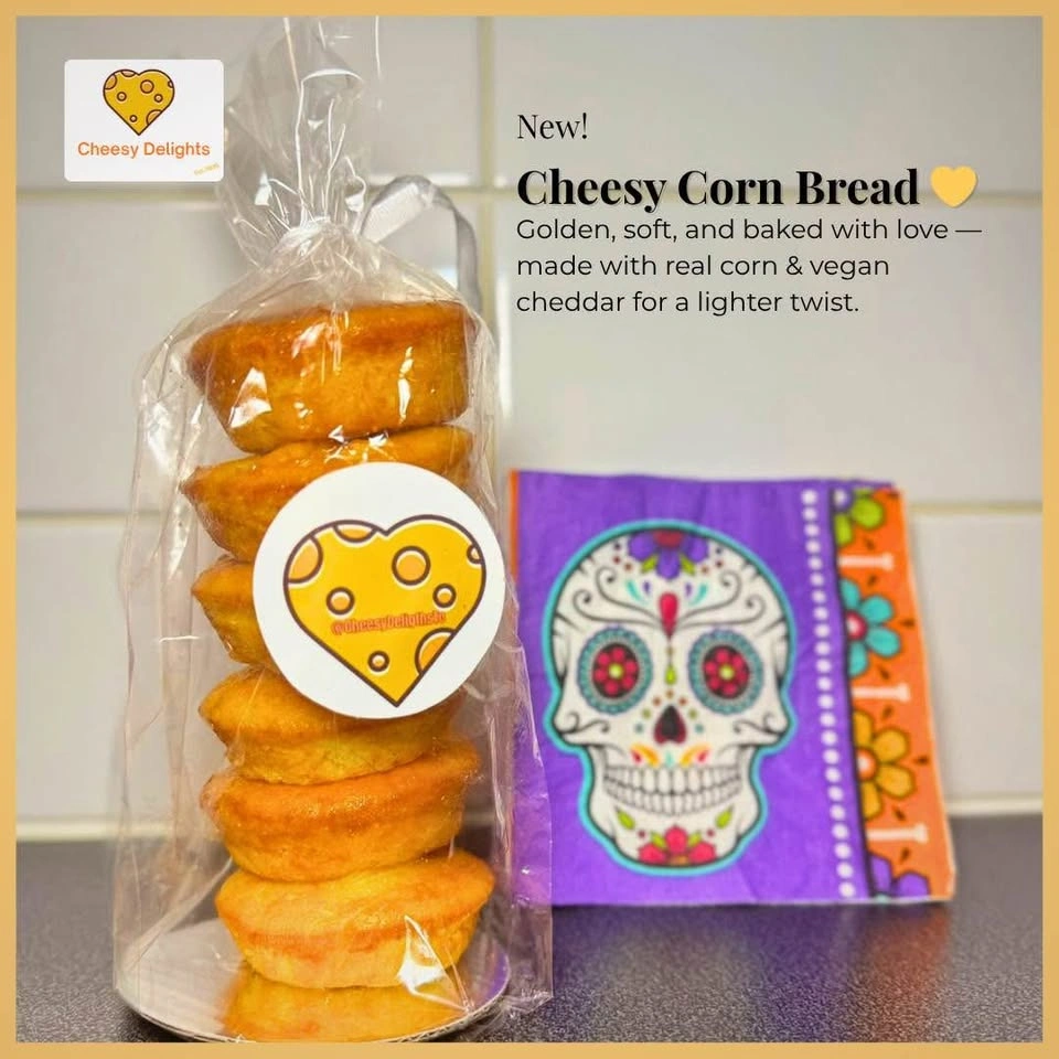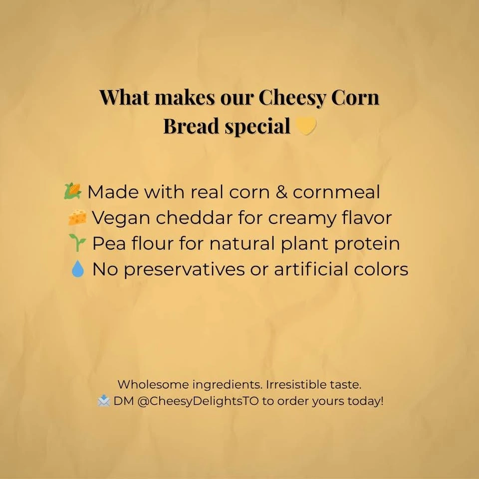Golden, soft, and baked with love π Our Cheesy Corn Bread is a healthier twist on a classic β made with real corn, vegan cheddar, and pea flour for a naturally rich and satisfying flavor. Perfect for breakfast, snacks, or pairing with coffee β π½ Made with real corn & cornmeal π§ Vegan cheddar for creamy flavor π± Pea flour for natural plant protein π§ No preservatives or artificial colors β¨ Wholesome ingredients. Irresistible taste. π¦ Sold in packs of 6 πPickup in Etobicoke (M9A)