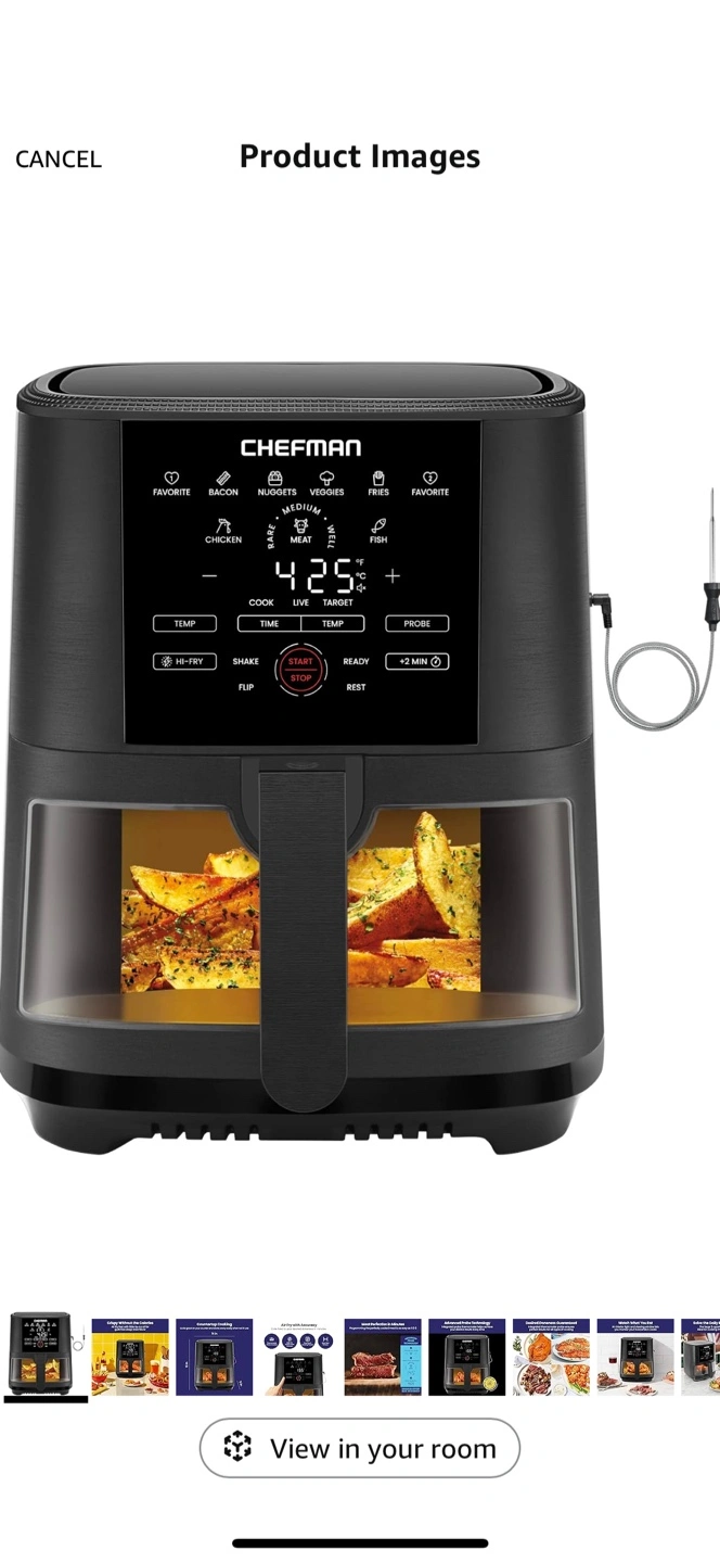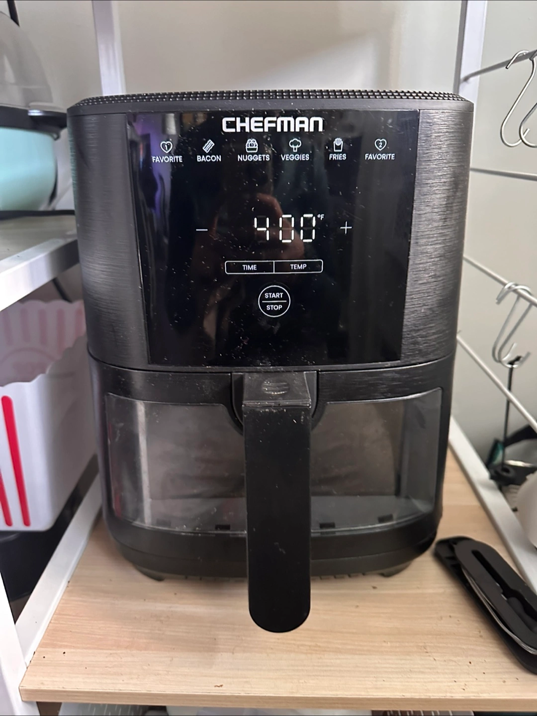 Selling a Chefman air fryer with a 5-quart capacity. It's black and features a digital display. It also has a nonstick square air fryer basket with a window. The parts are dishwasher safe, making cleanup a breeze!
