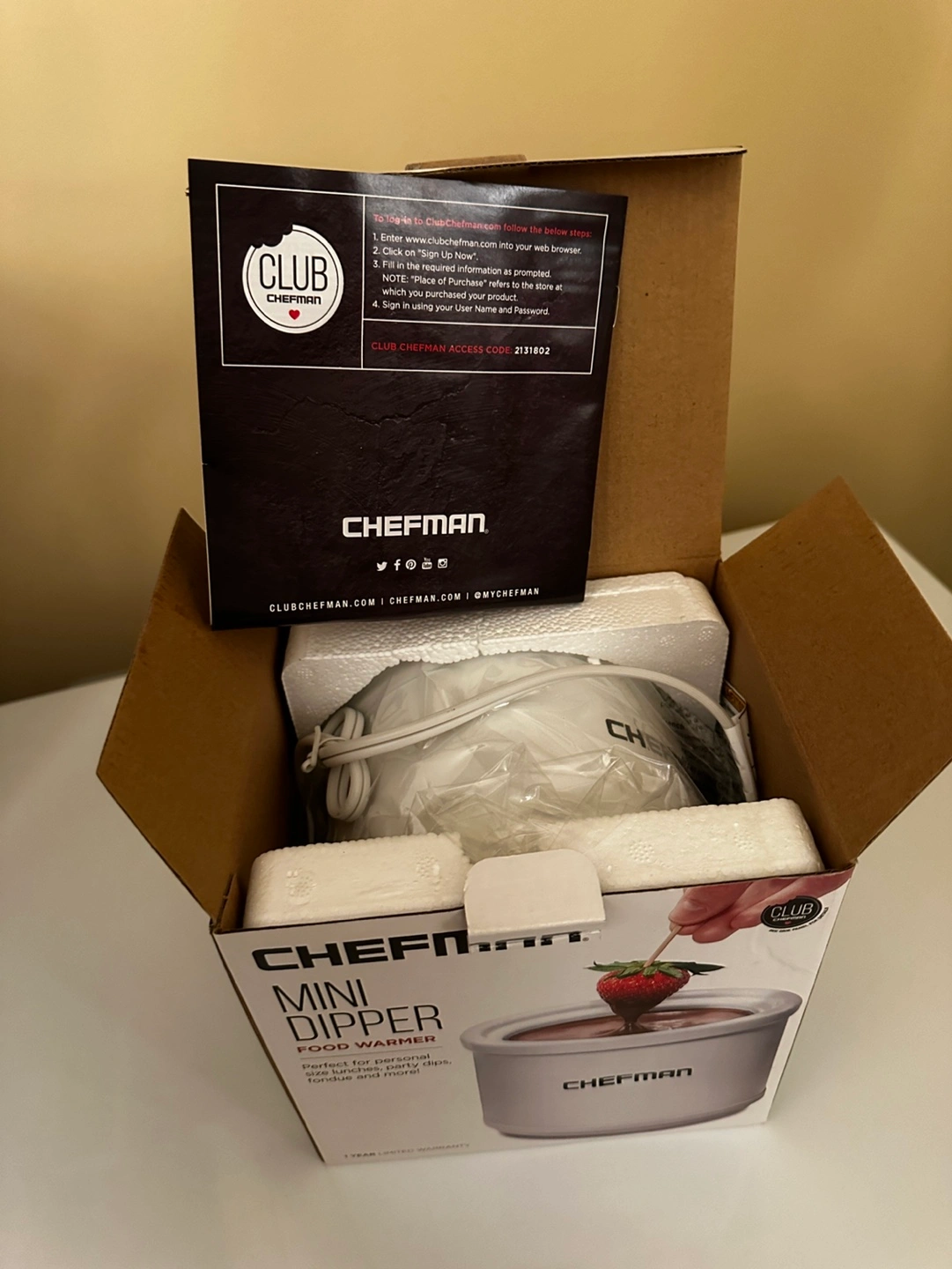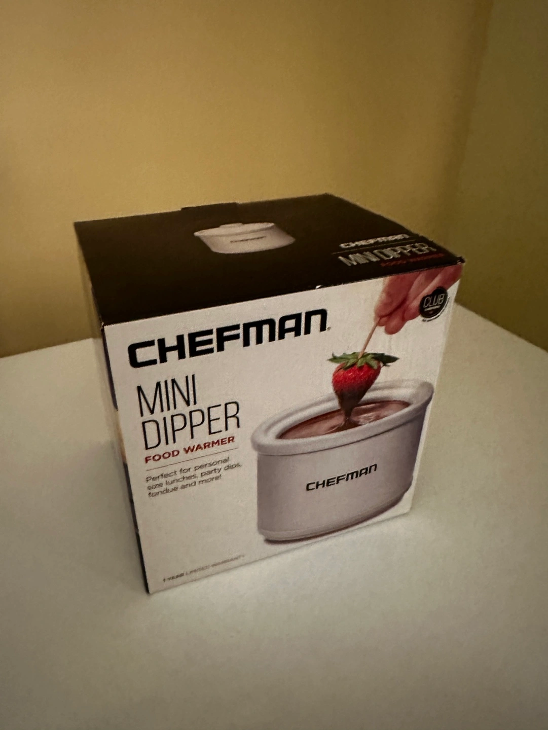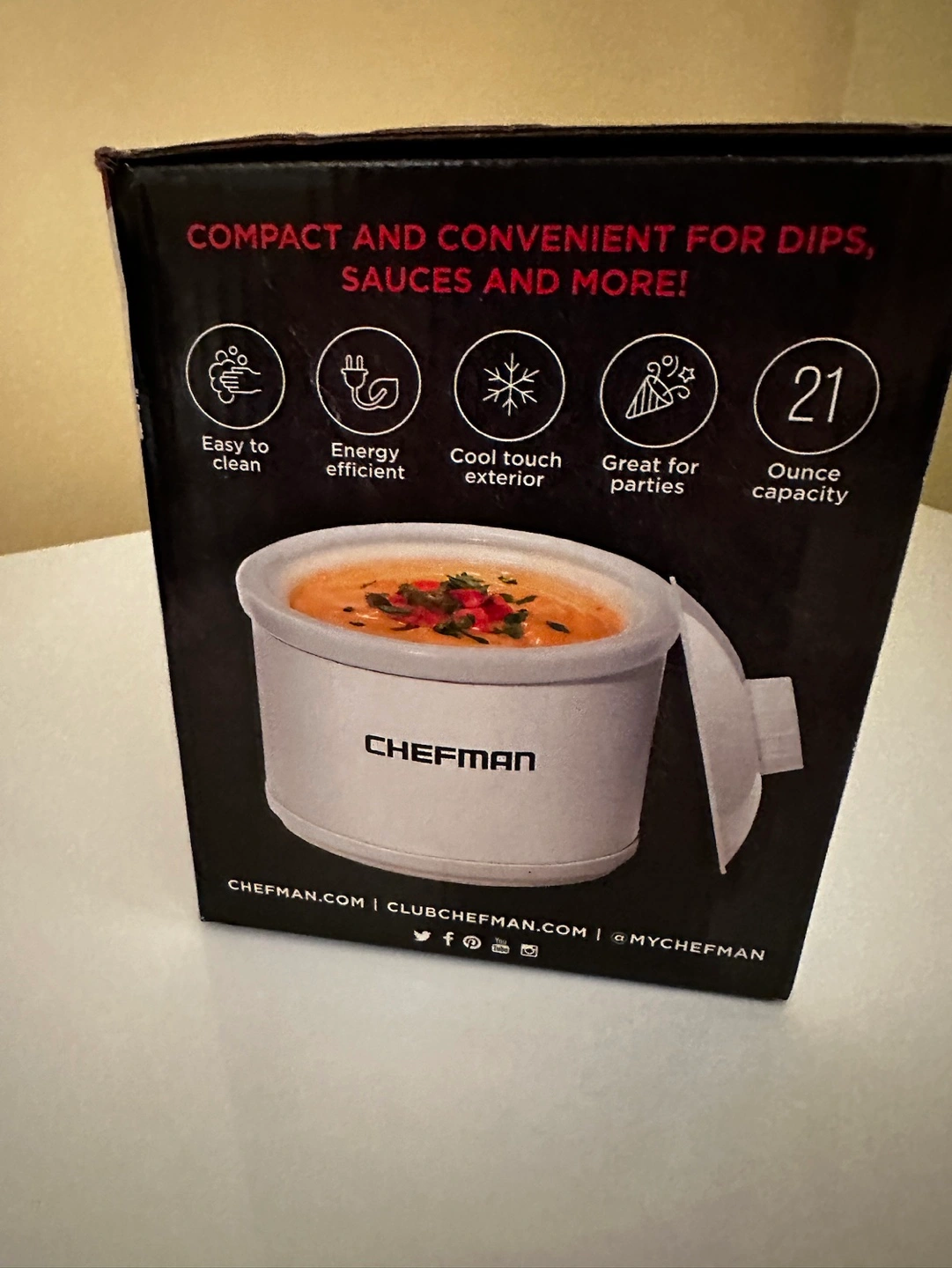 Brand new, never used Chefman mini dipper food warmer. 21 ounce capacity. Perfect for dips, sauces, fondue and more. Compact and convenient. Energy efficient, easy to clean, cool touch exterior.