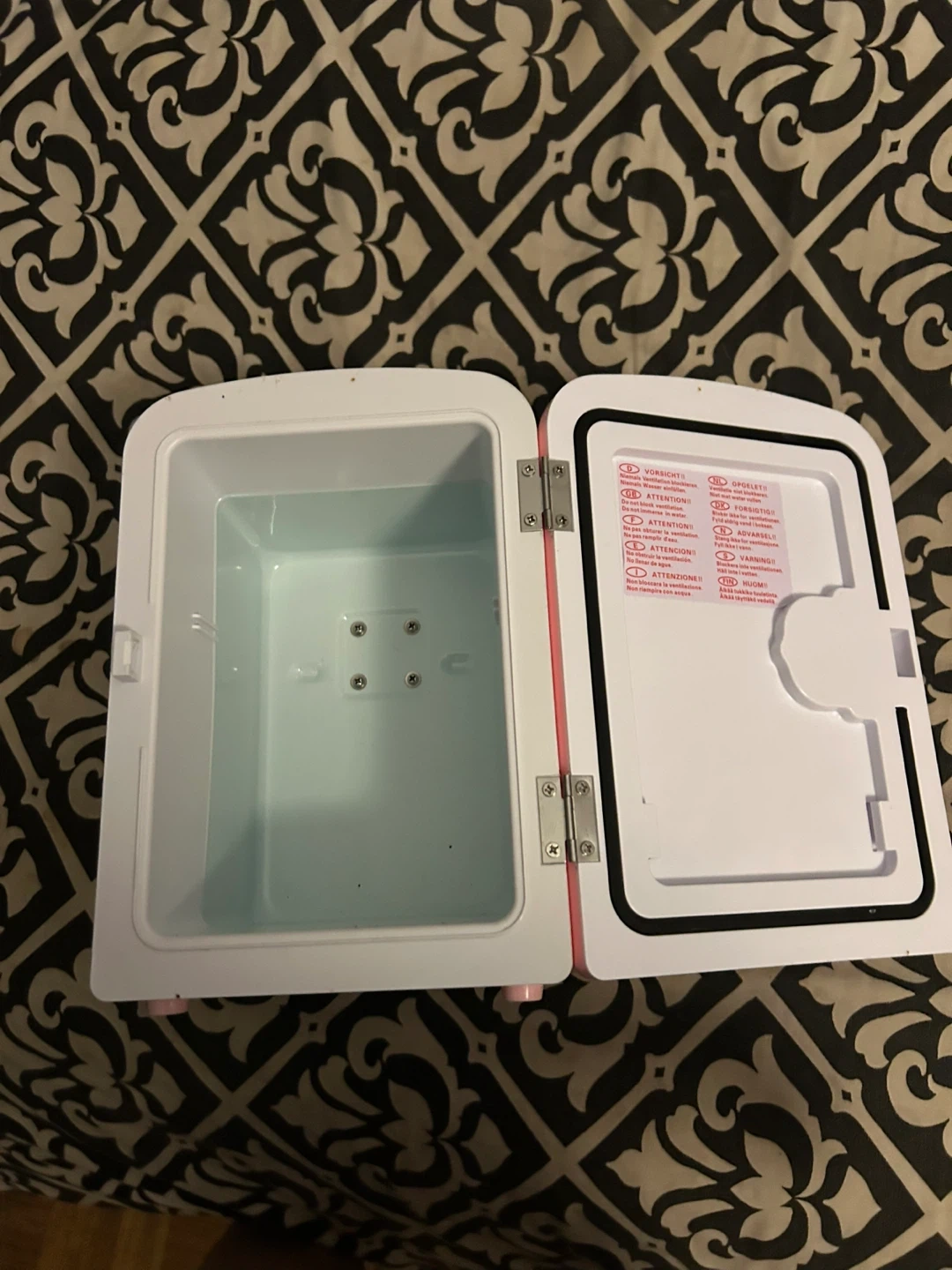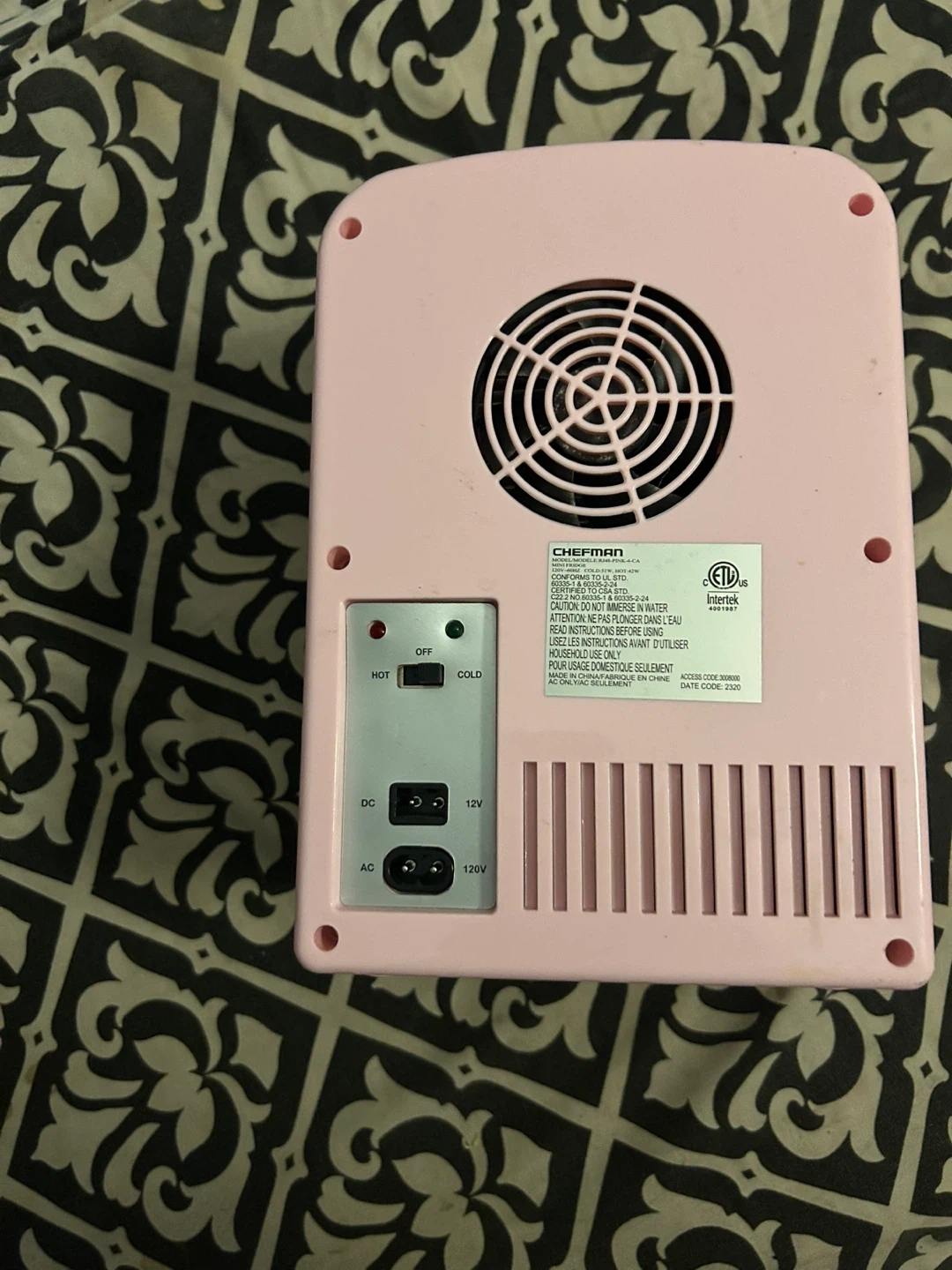 Selling a cute pink Chefman mini fridge! It's in great condition and perfect for keeping your snacks and drinks cool. It has both hot and cold settings, and can be powered by DC 12V or AC 120V.