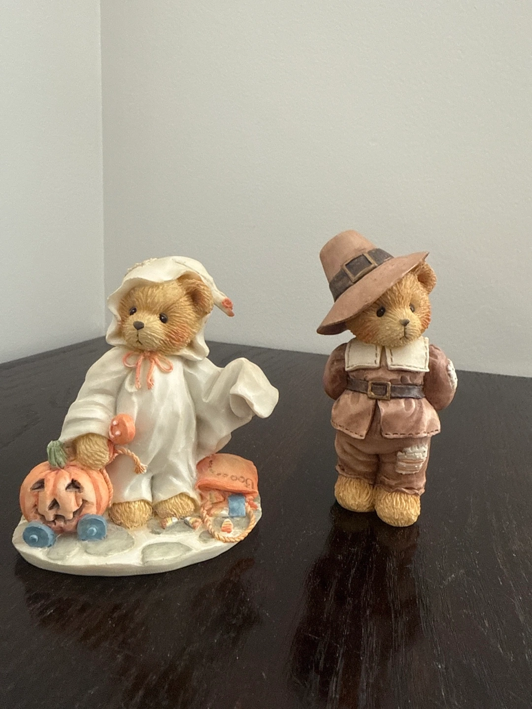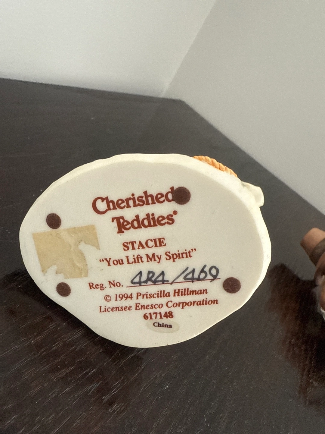 Selling two adorable Cherished Teddies figurines! One is named Stacie "You Lift My Spirit" and the other is Jedediah "Giving Thanks For Friends". Both are from 1994 and licensed by Enesco Corporation. They're in great shape and would make a lovely addition to any collection