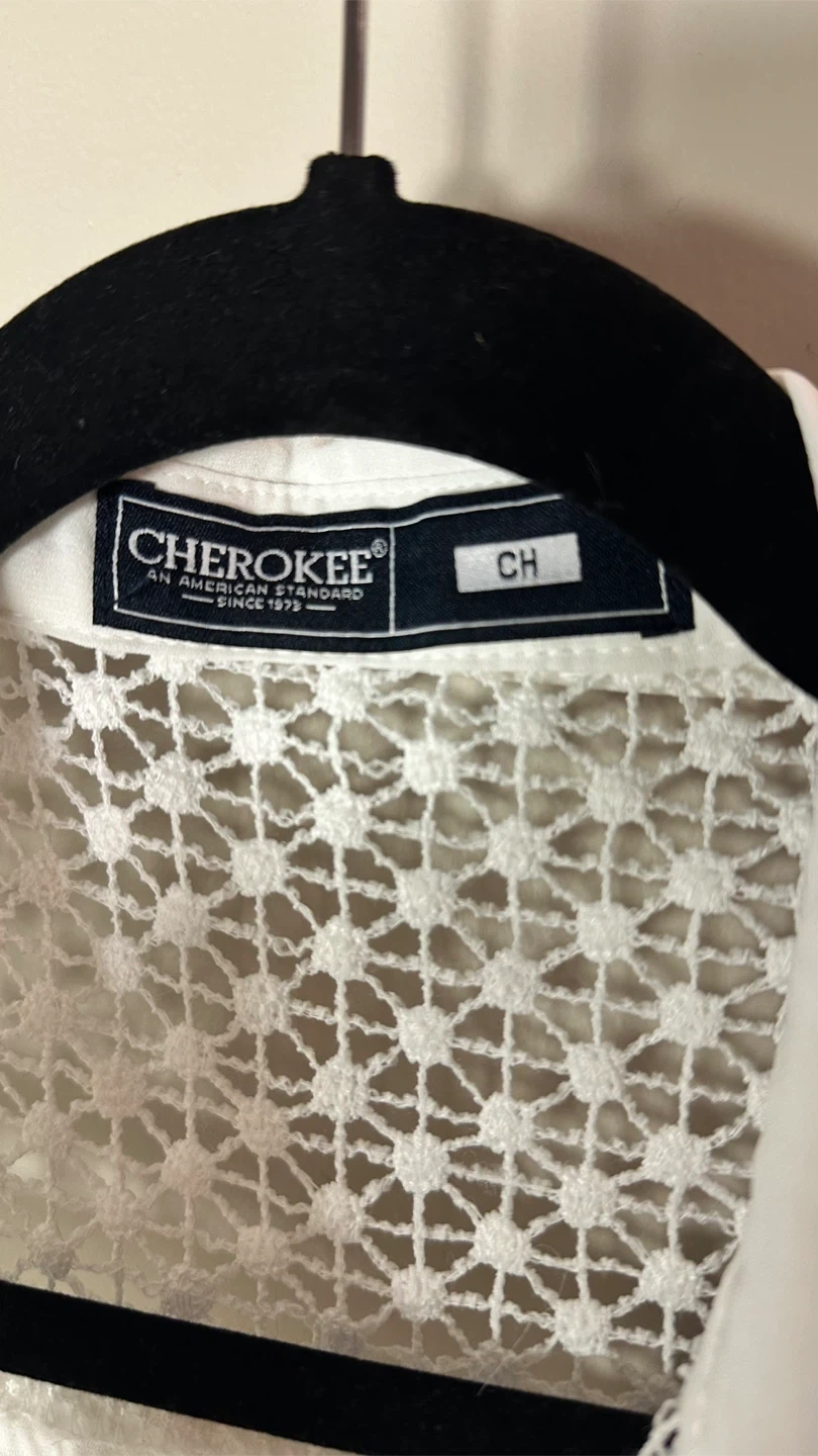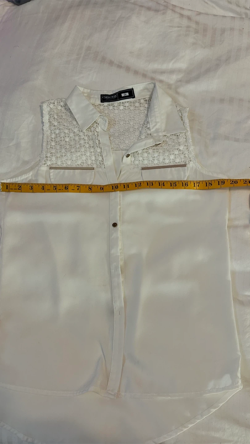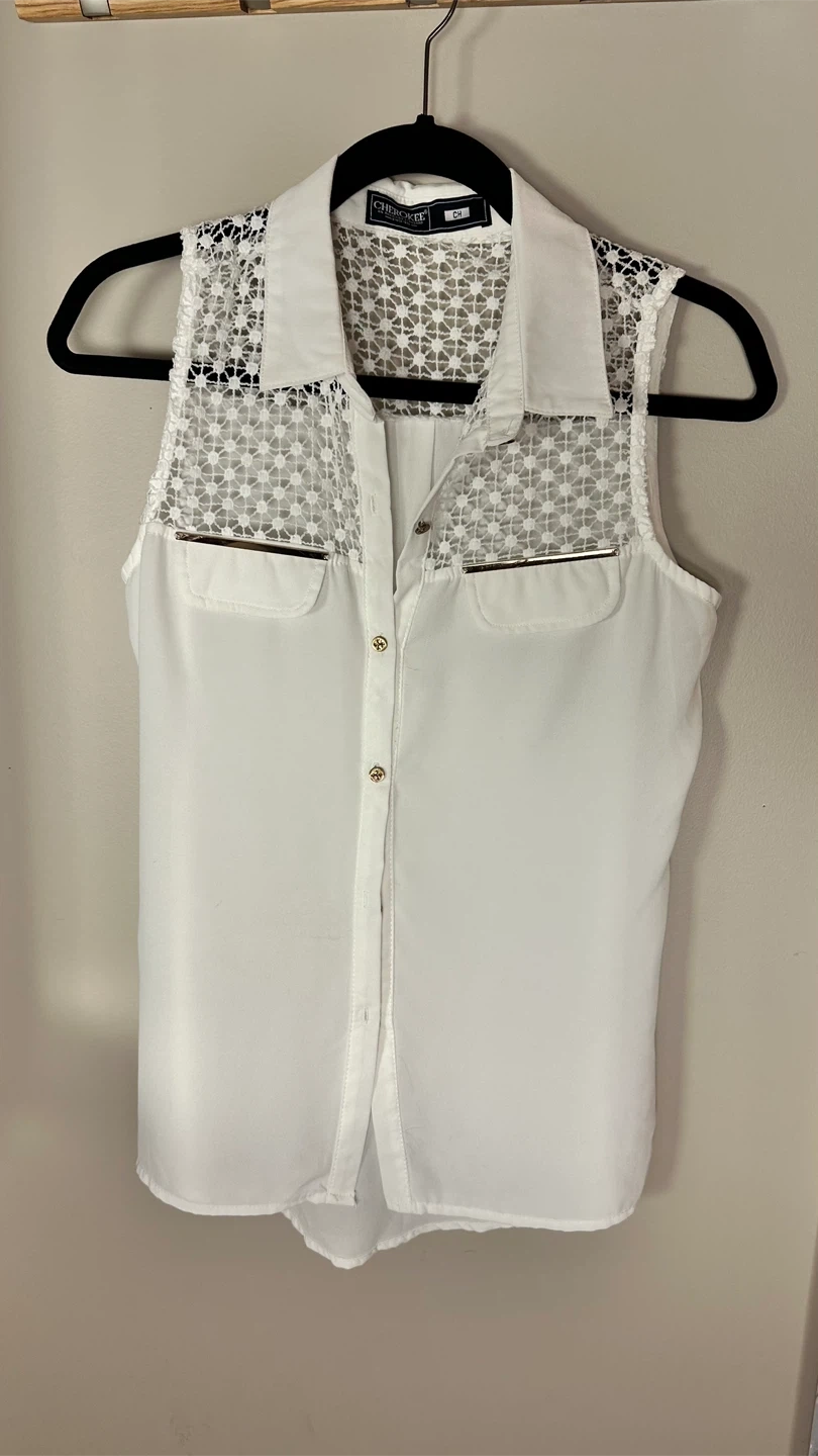 Selling a cute white sleeveless top from Cherokee! It has a unique lace detail on the upper part and gold accents on the pockets. Size CH.