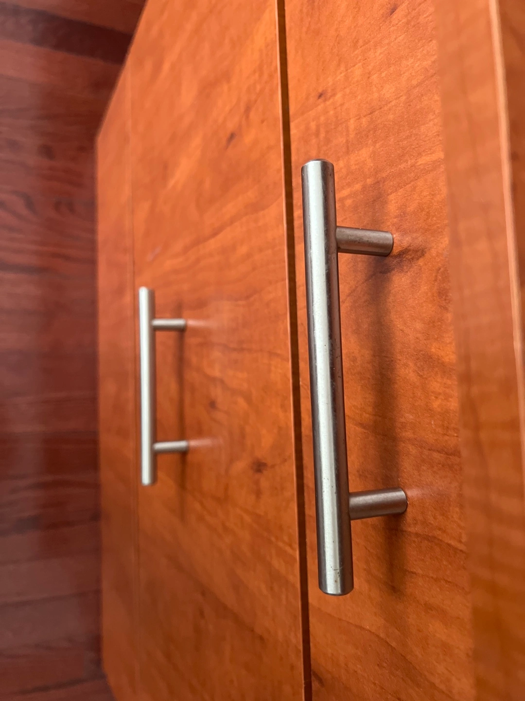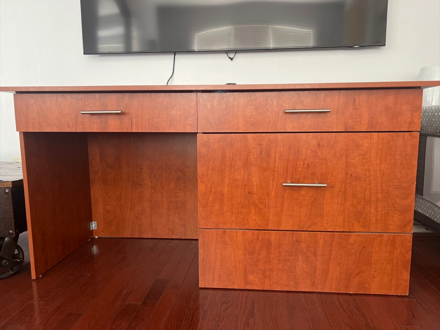 Large cherry wood entertainment center. Features two drawers and a large cabinet. Perfect for living room or home office. Good condition.No wear or tear. Pet free home. Amazing condition. You can Use it as a TV console or for office table. Had enough storage space with 3 drawers, 2 are in similar sizes and 1 has large capacity. Only serious buyers can message. Good quality handles used. No negotiations. Already at low prices