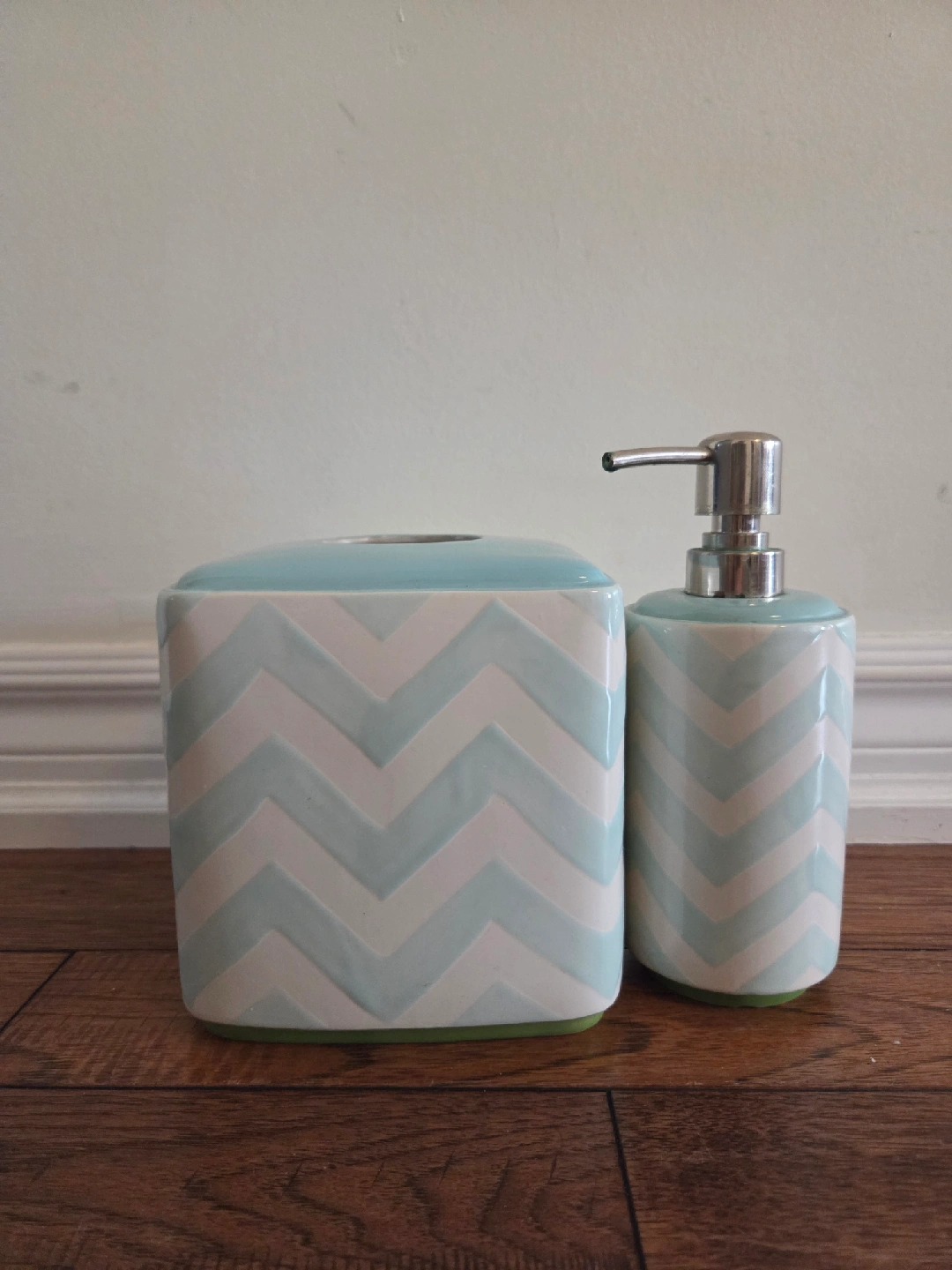 Cute bathroom set with a chevron pattern! Includes a soap dispenser and a tissue box cover. The colours are a light aqua and white. Perfect for adding a touch of style to your bathroom decor!