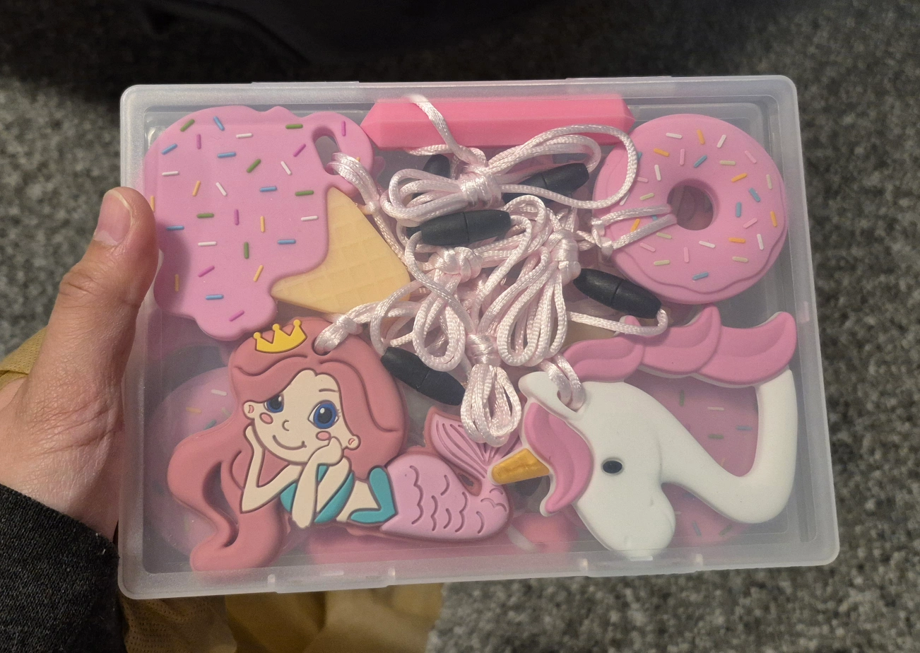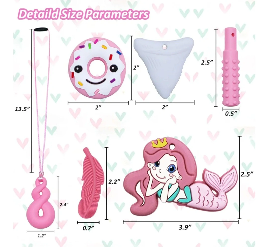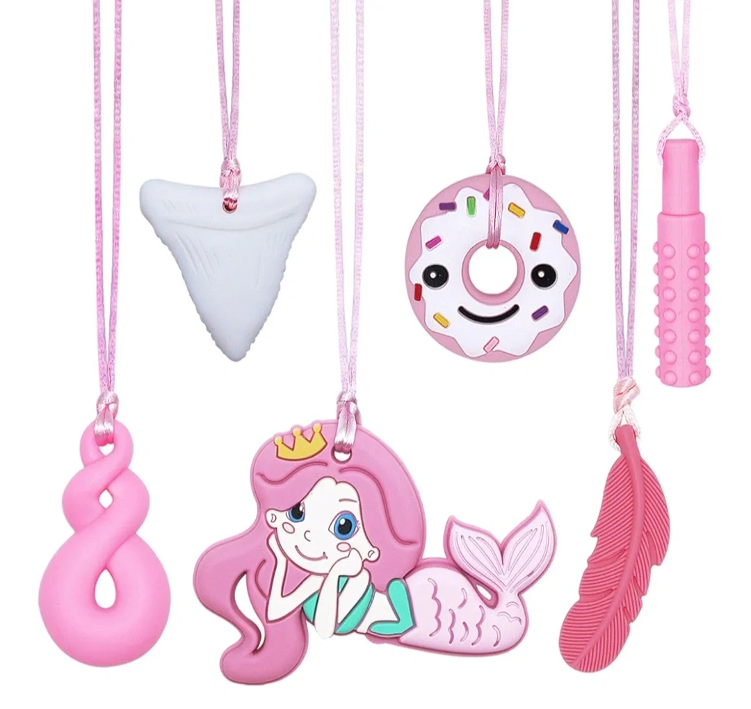 Sensory chew necklaces in a variety of fun shapes! Perfect for kids who need to chew to help them focus or calm down. The set includes a donut, mermaid, ice cream, feather, and other cute shapes. The necklaces are made of safe, non-toxic silicone and come in a handy storage box