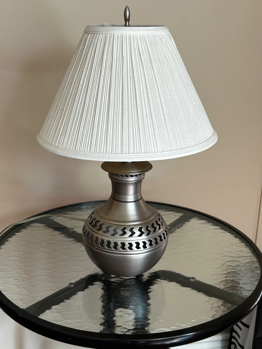 Add warmth and style to your space with this beautiful table lamp. • Solid metallic silver base with a hint of bronze tones • Classic beige fabric shade for a soft, warm glow • Timeless design that suits both modern and traditional décor Height 23”, base width 25”