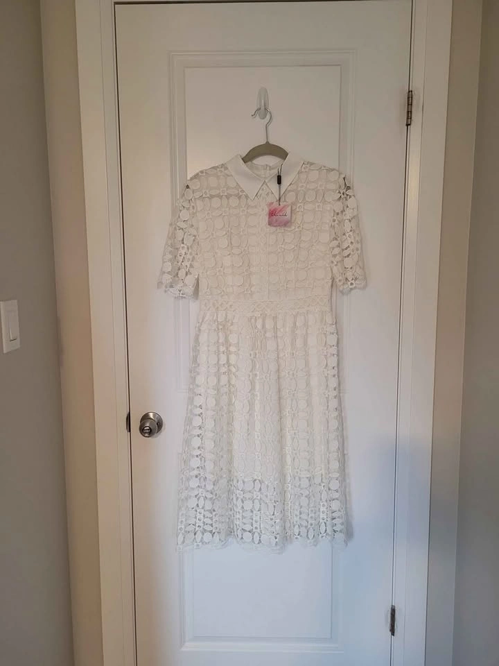 Brand new with tags. White Chic Wish dress. Purchased for an event but it didn't arrive in time. Size large. Zippered back. Collar detail. Measurements laying flat: Armpit to armpit - 18 inches Waist - 15 inches Pick-up in Wellesley. We're moving! Check out my other ads!