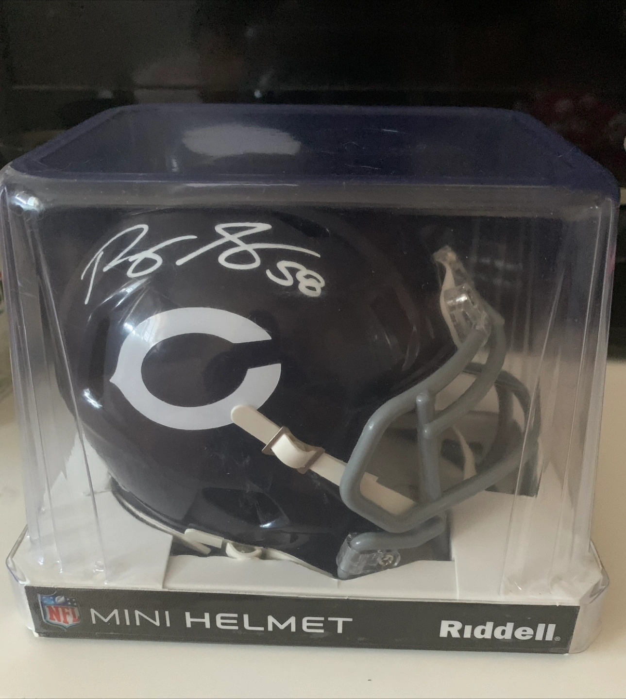 A mini helmet inside a clear plastic case. Features the Chicago Bears logo. Includes a signature on the side. This would look great displayed on a desk to enjoy while you sip on your morning coffee. 227 Vodden St E, Brampton, ON L6V 4J4 Tim Hortons Parking lot