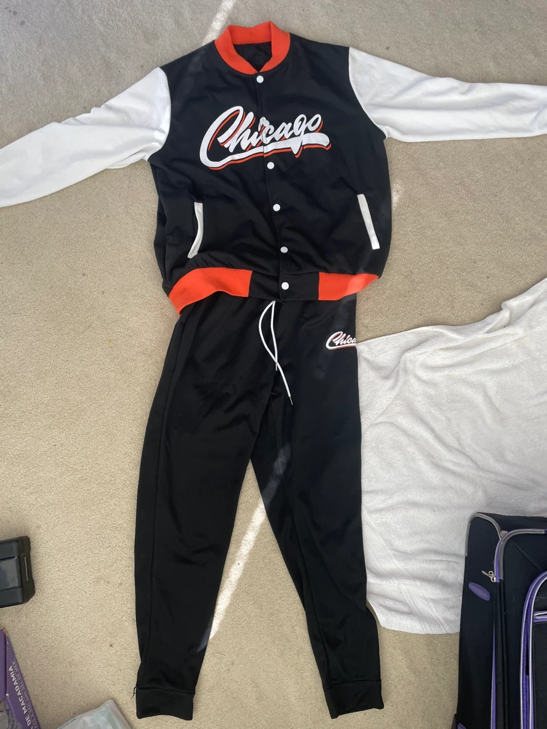Selling a Chicago-themed jacket and pants set. The jacket is black with white sleeves and orange accents, featuring the Chicago logo. The pants are black with a matching Chicago logo. Great for showing off your city pride!