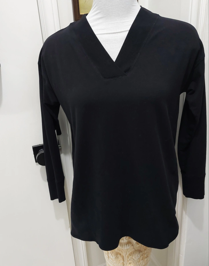 Black long-sleeve top. V-neck design. Soft and comfortable fabric. Featured a unique v neck style. Made in Indonesia. Recently laundered. From smoke and pet - free home. Please browse through my other listings. Discount applies to bundling.