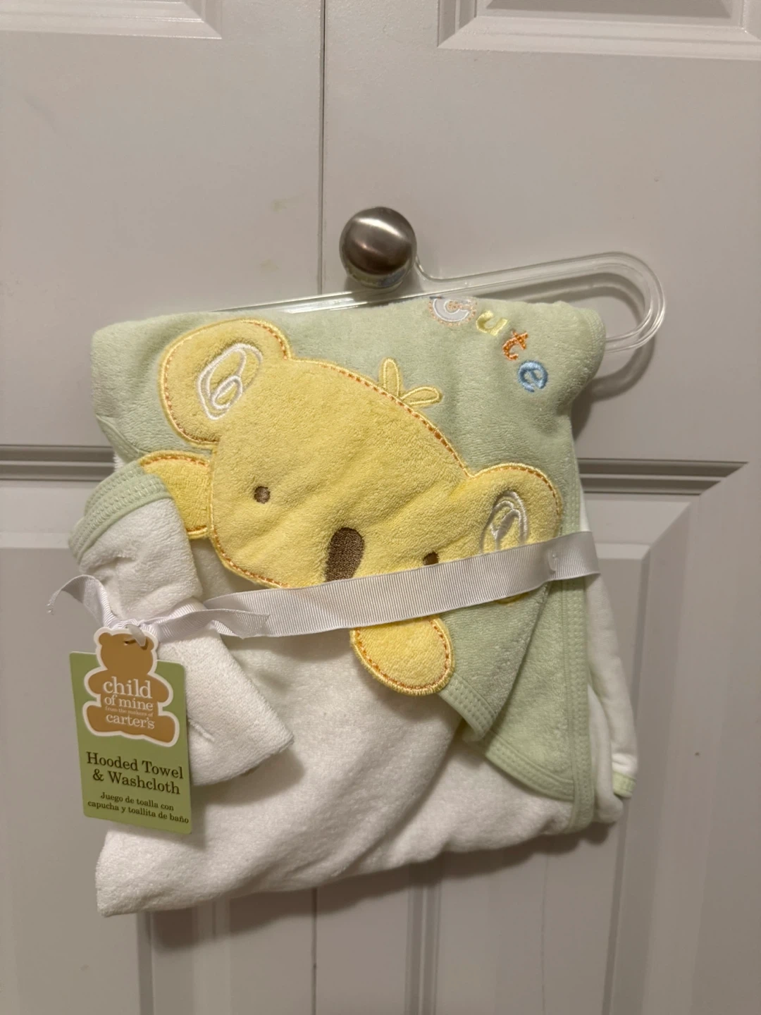 Super soft hooded towel with koala design 🐨 • Includes matching washcloth • Gender neutral (green/yellow) – great baby shower gift • Still brand new with tags, never used