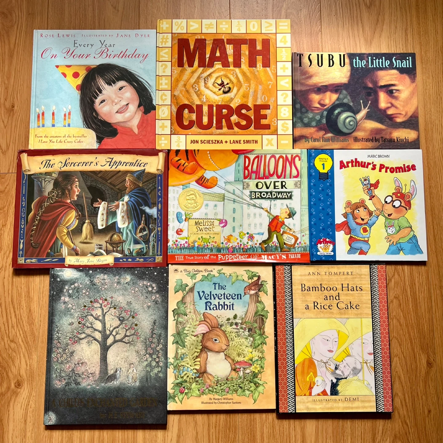 Selling a collection of children's books! All books are hardcover and in excellent condition! $5 each or $40 for all 9 books! Titles include: - Every Year On Your Birthday by Rose Lewis - Math Curse by Jon Scieszka and Lane Smith - Tsubu the Little Snail by Carol Ann Williams - The Sorcerer's Apprentice by Mary Jane Begin - Balloons Over Broadway by Melissa Sweet - Arthur's Promise by Marc Brown - A Child's Enchanted Garden - The Velveteen Rabbit by Margery Williams - Bamboo Hats and a Rice Cake by Ann Tompert Pickup in Richmond.