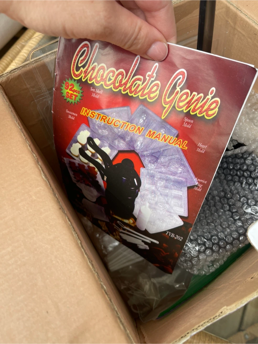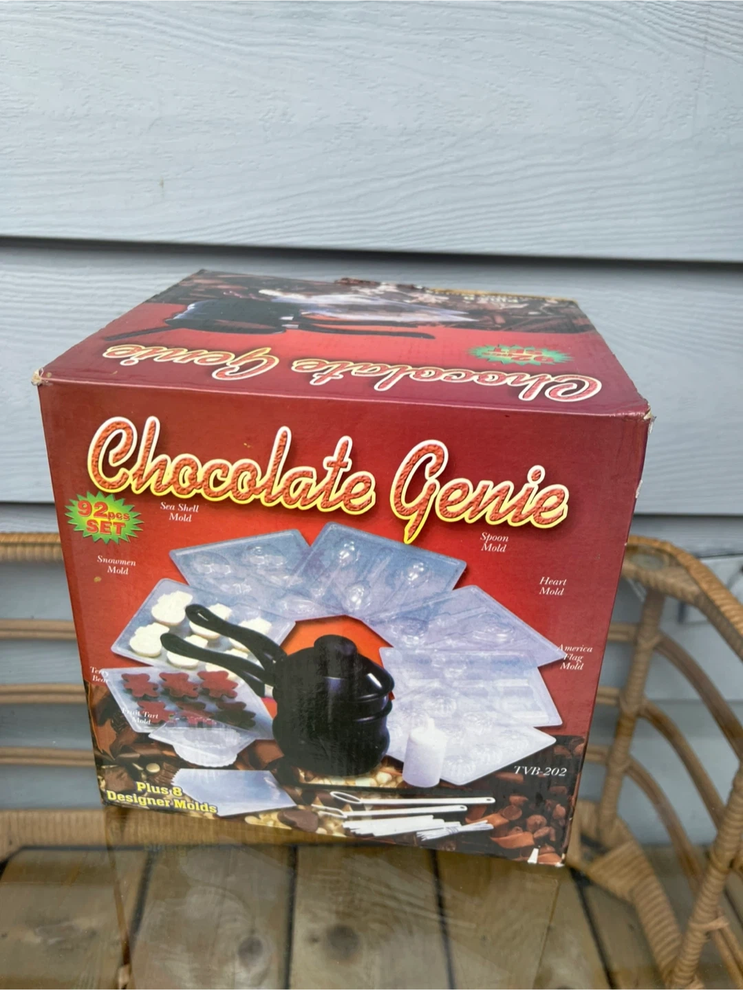 Selling a Chocolate Genie 92-piece set! It comes with a pot, spatula, and various molds for making chocolate treats. The set is still in its original box and includes all the components. Perfect for anyone who enjoys making homemade chocolates