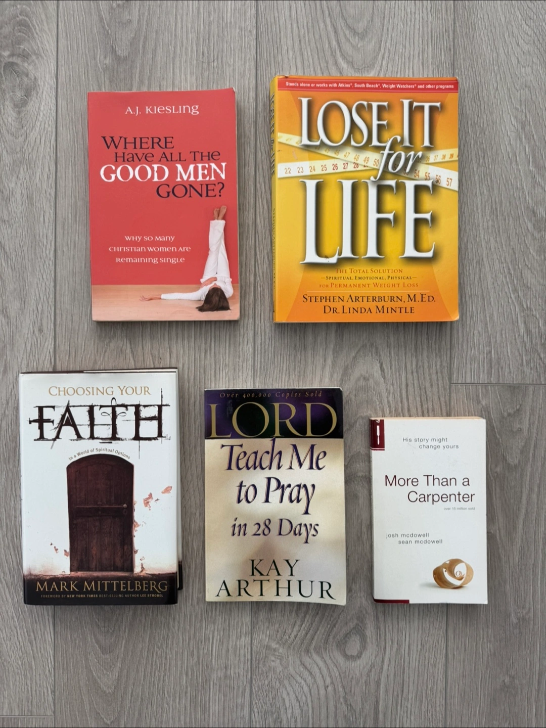 Selling a bundle of Christian books. Titles include: - Where Have All the Good Men Gone? by A.J. Kiesling - Lose It for Life by Stephen Arterburn and Dr. Linda Mintle - Choosing Your Faith by Mark Mittelberg - Lord, Teach Me to Pray in 28 Days by Kay Arthur - More Than a Carpenter by Josh McDowell and Sean McDowell