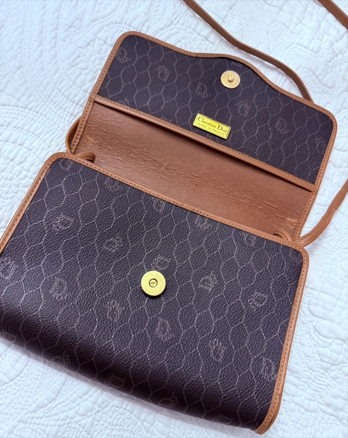 Selling an authentic lovely vintage 1980՚s Dior shoulder bag with the classic honeycomb pattern! It's in great shape and perfect for adding a touch of vintage elegance to any outfit. The bag features a brown colour scheme and a long shoulder strap for comfortable wear