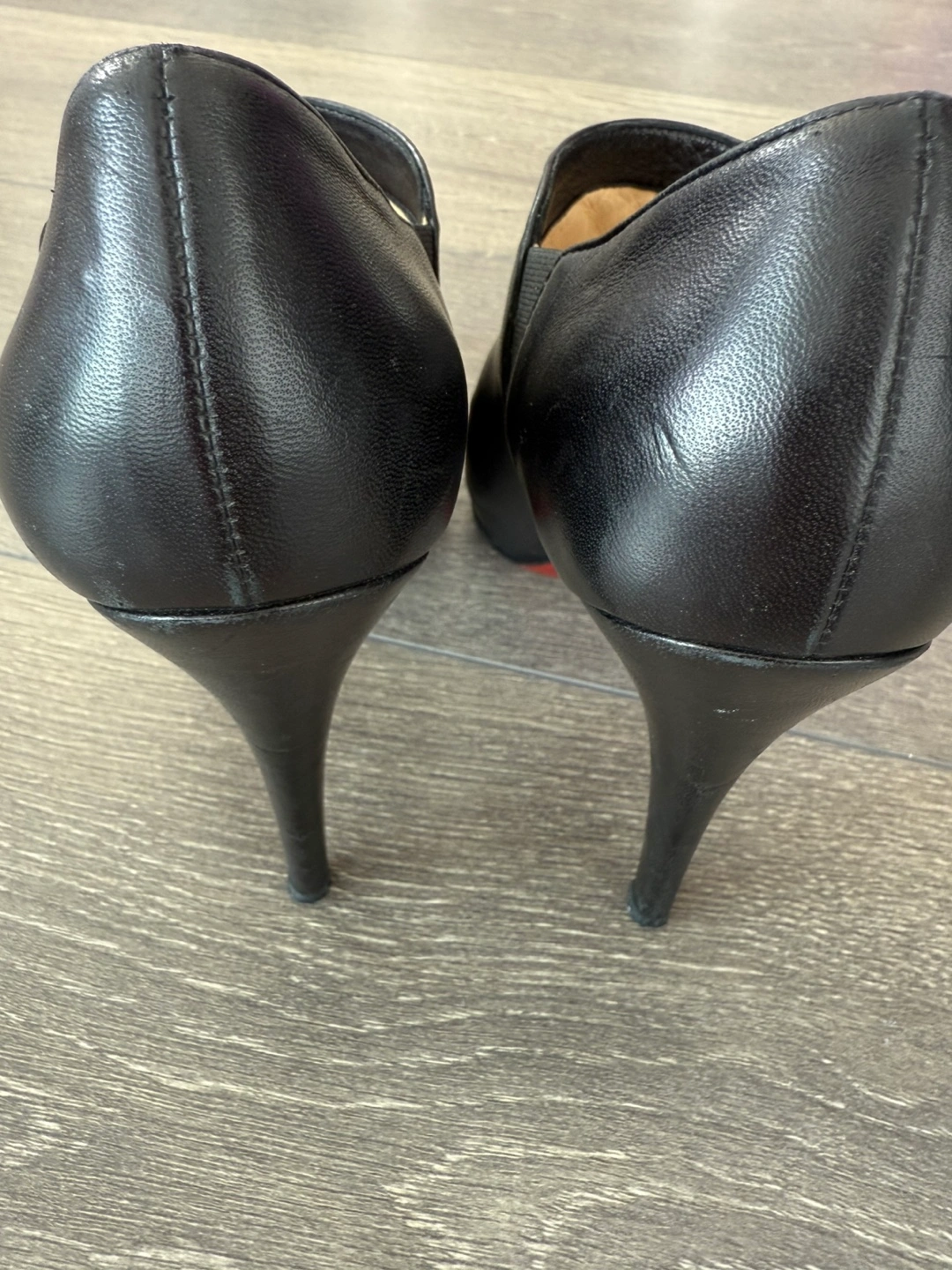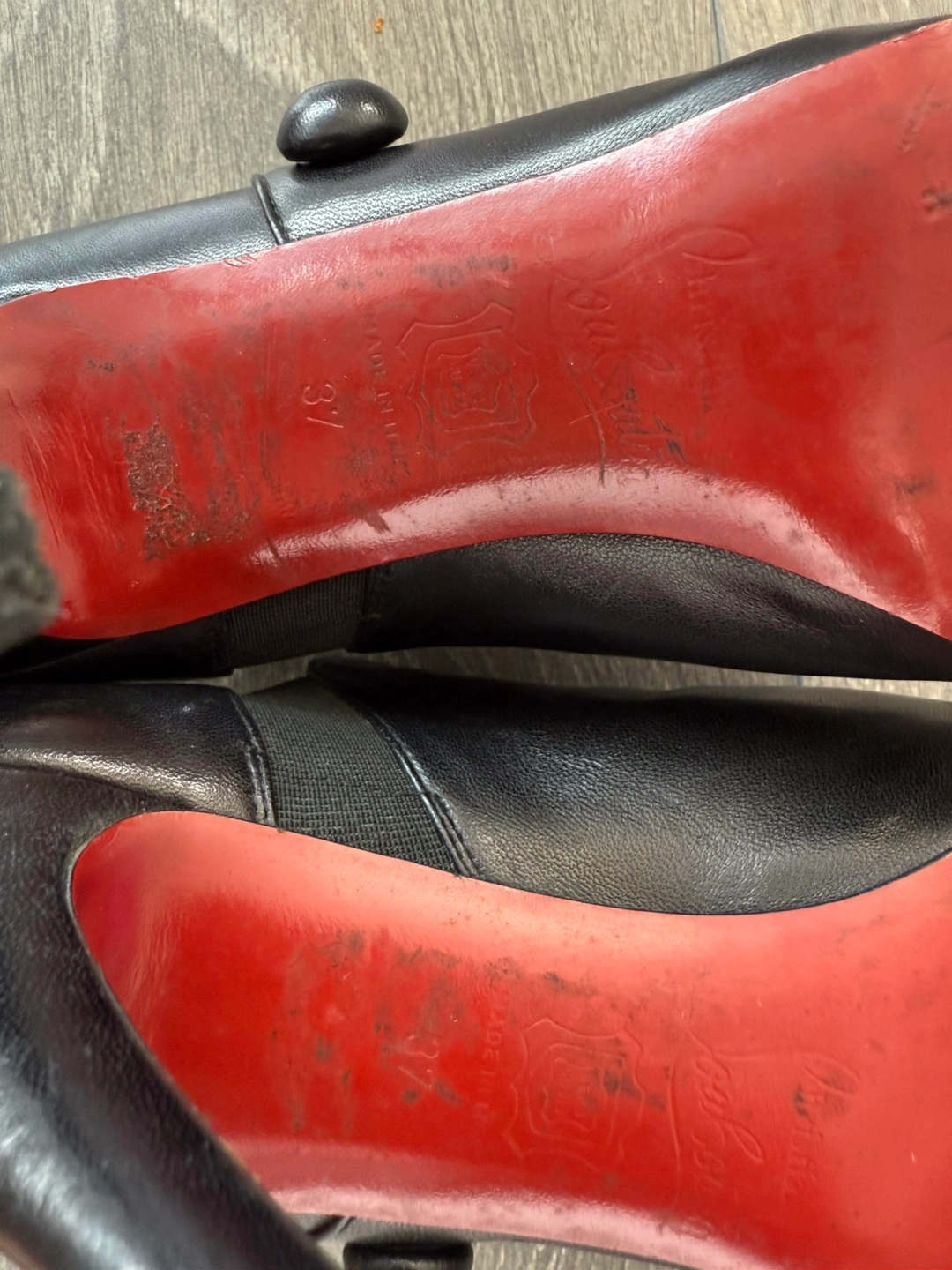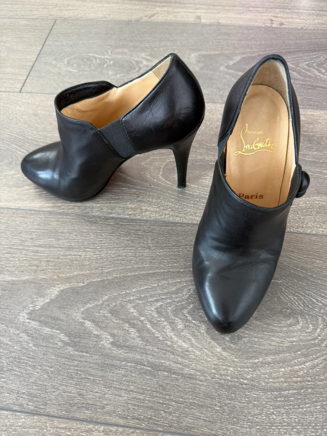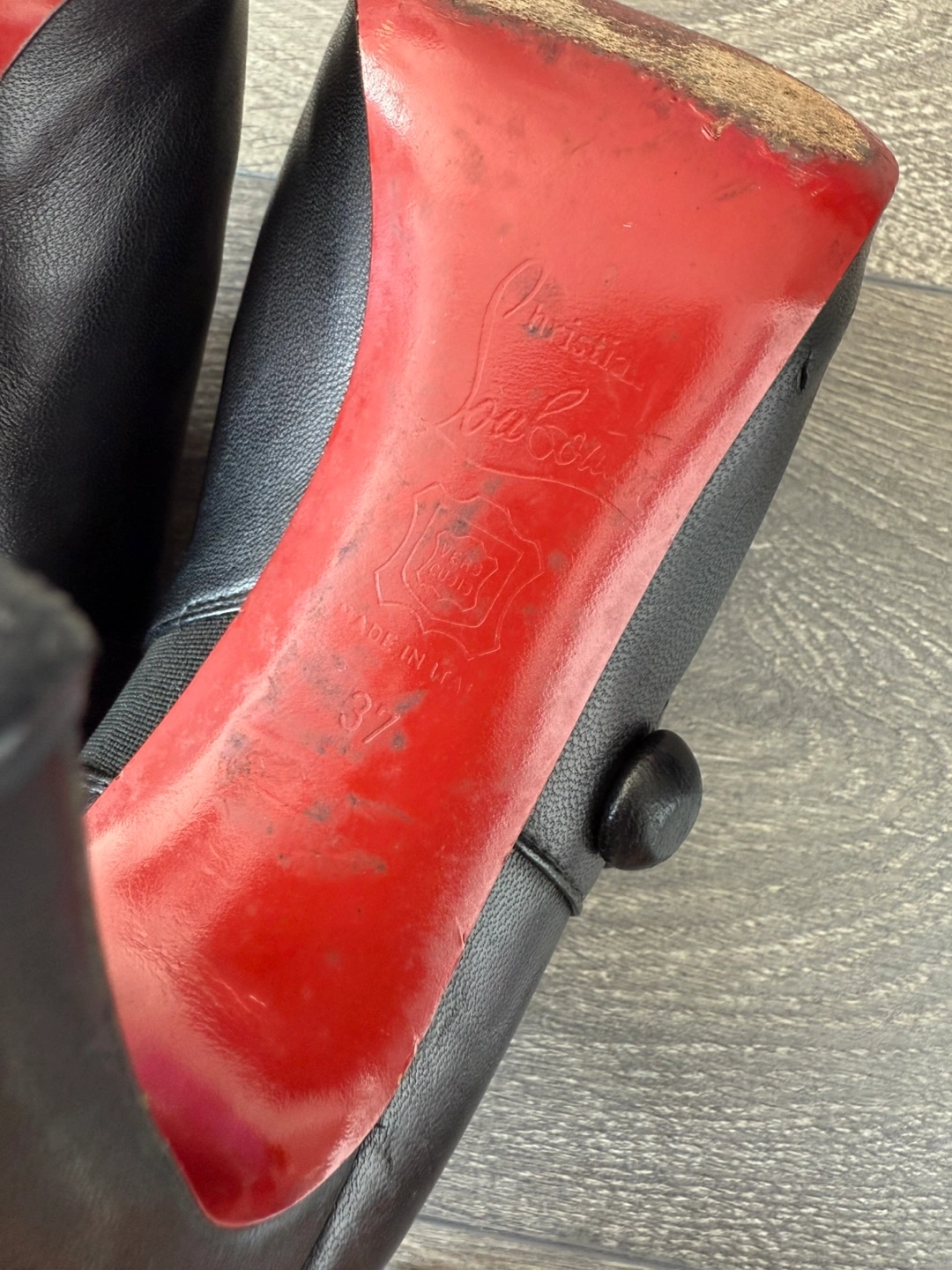 Selling a pair of Christian Louboutin black leather booties. They are a size 37 and feature a classic design with the iconic red sole. They have some signs of wear on shoes , but are otherwise in good condition.