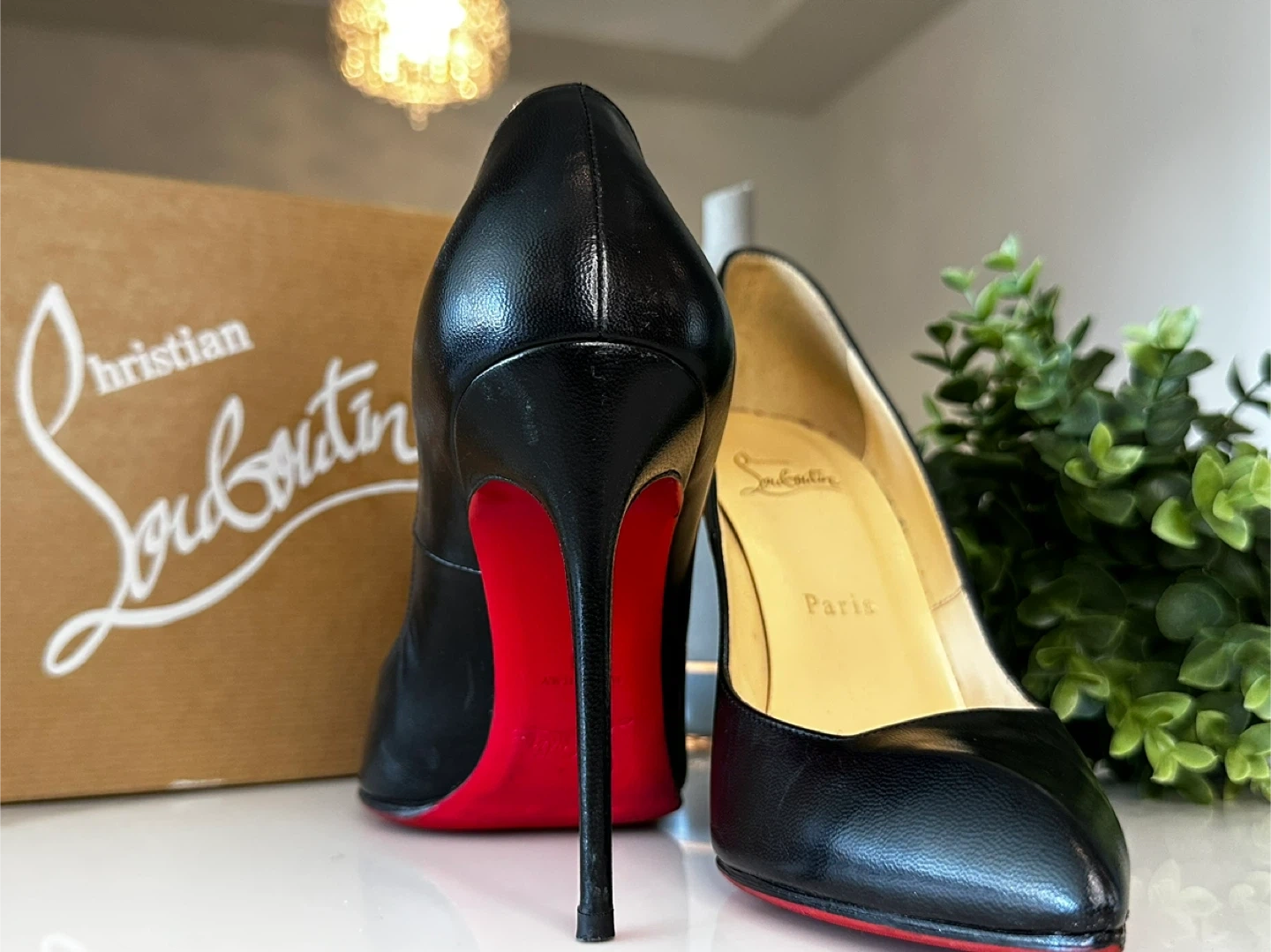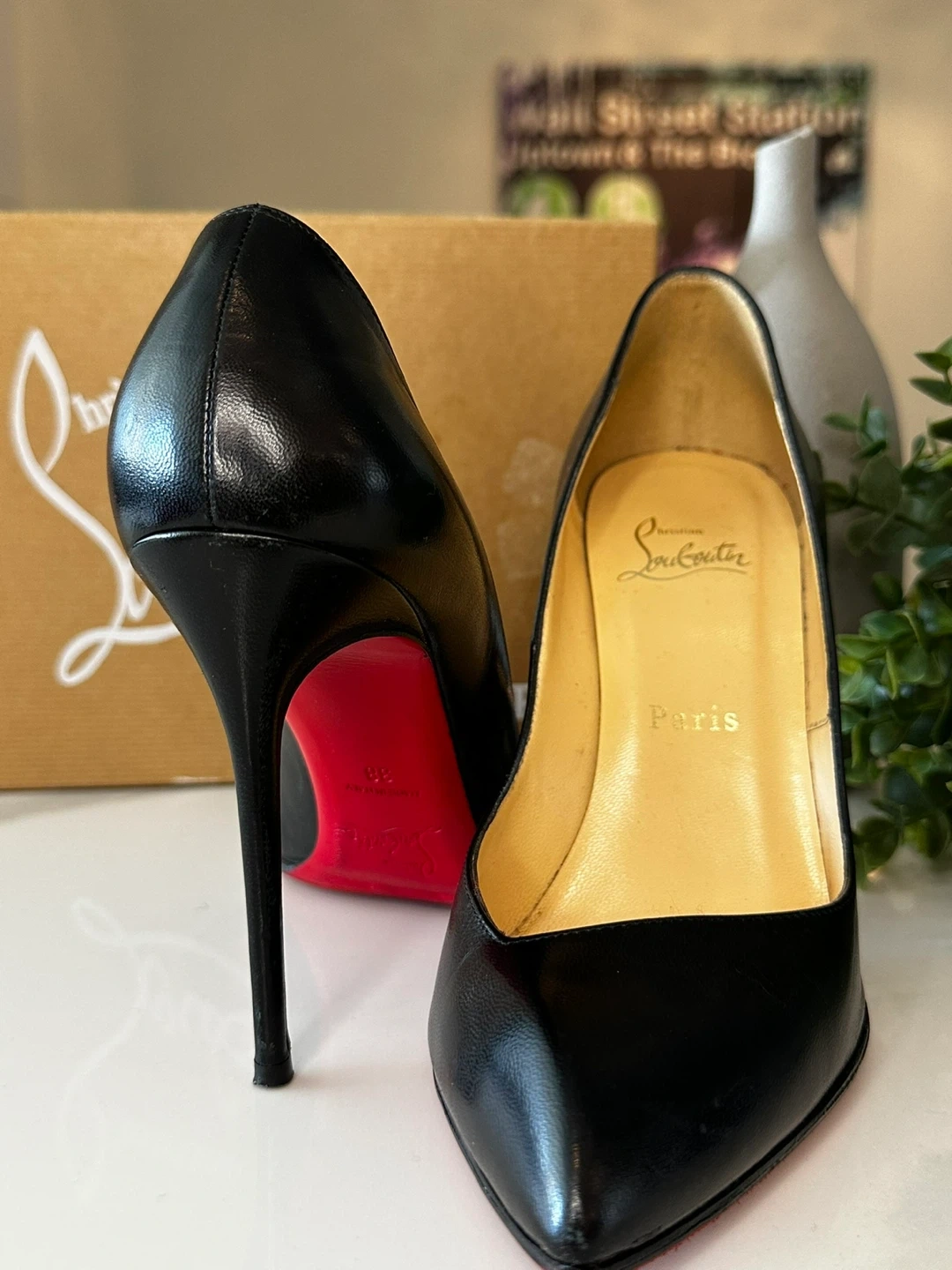 Selling a pair of Christian Louboutin black Corneille leather heels in size 38. These classic heels have the iconic red sole and come with the original box and dust bag. Perfect for adding a touch of luxury to any outfit!