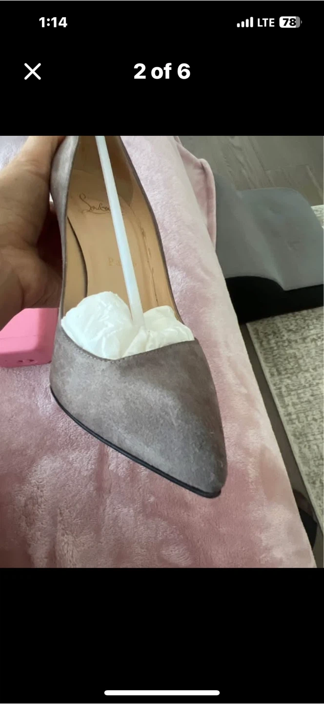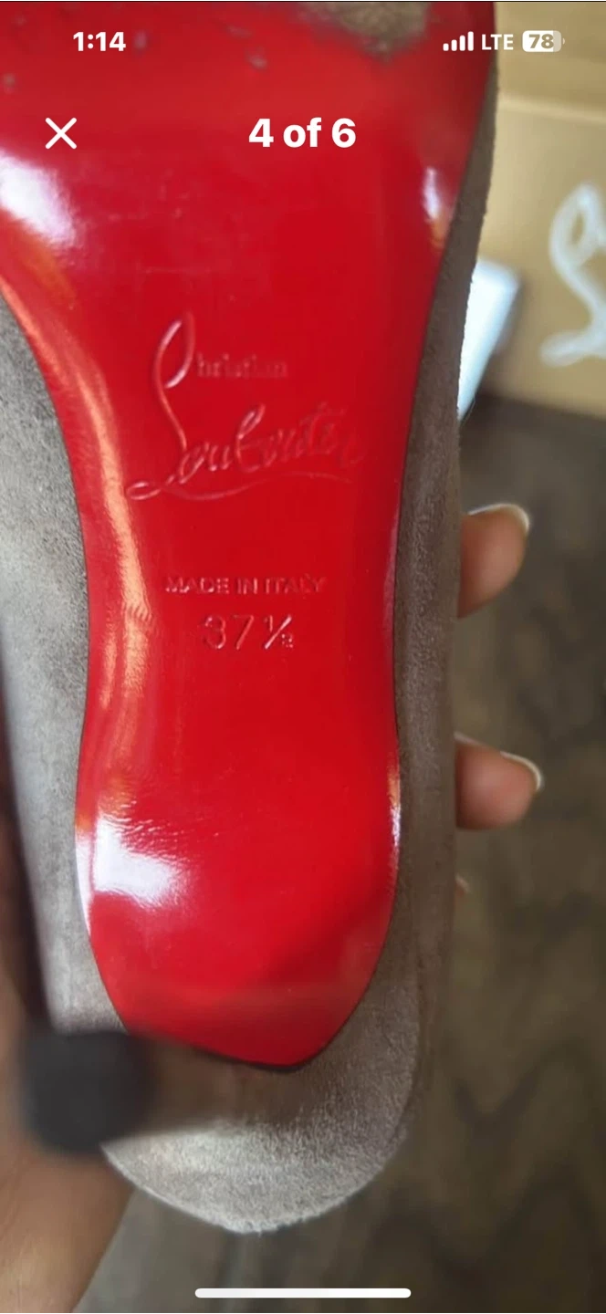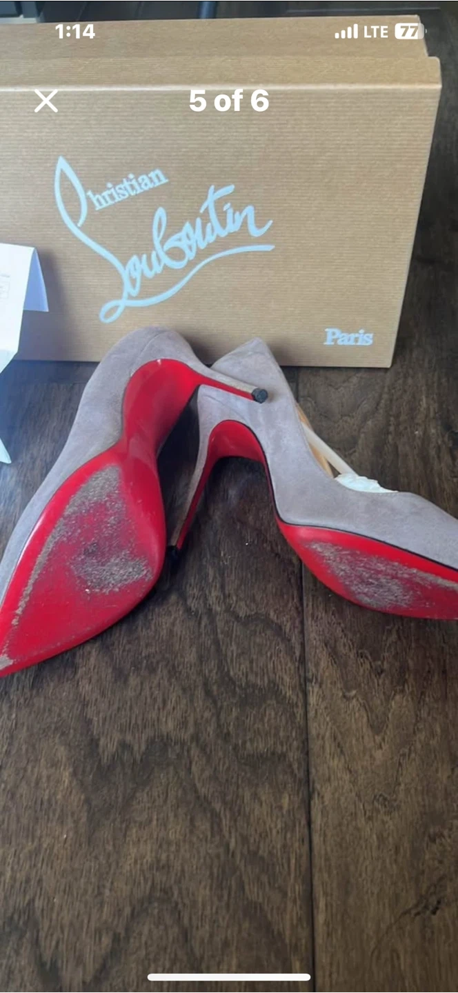 Selling a pair of Christian Louboutin heels in a lovely grey suede! They are a European size 37.5. The signature red soles show some signs of wear, but they still have lots of life left in them. Comes with the original box and dust bag! Original price was $988.75 CAD