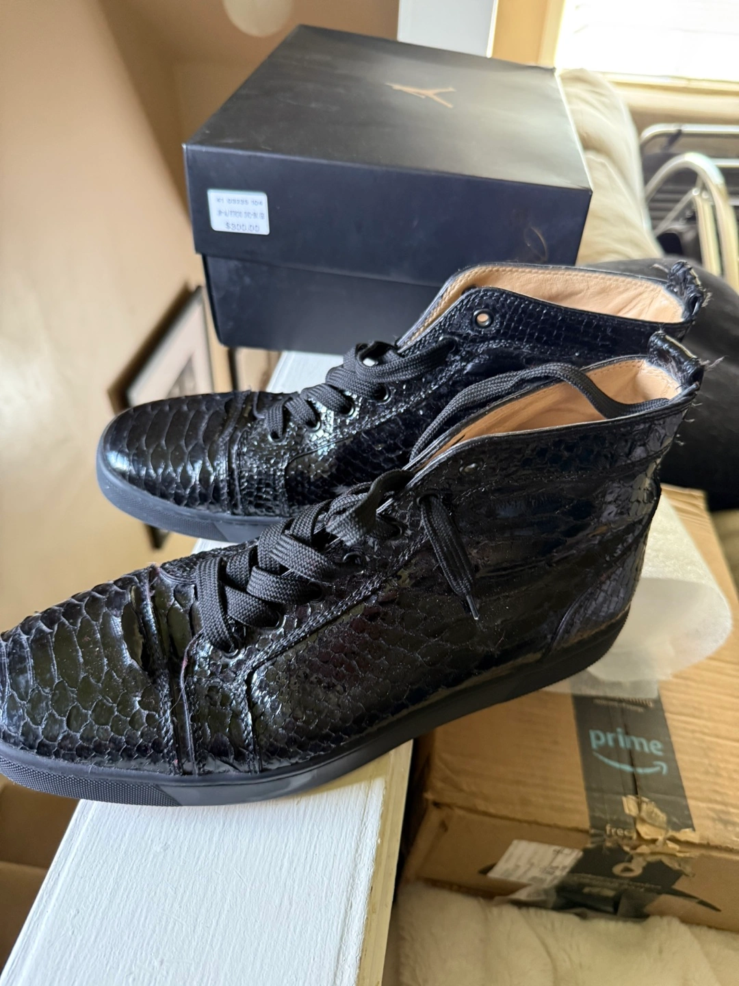 These Christian Louboutin high-top sneakers have a unique python skin texture and come in a sleek black colour. They originally retailed for $3000. The box is included!