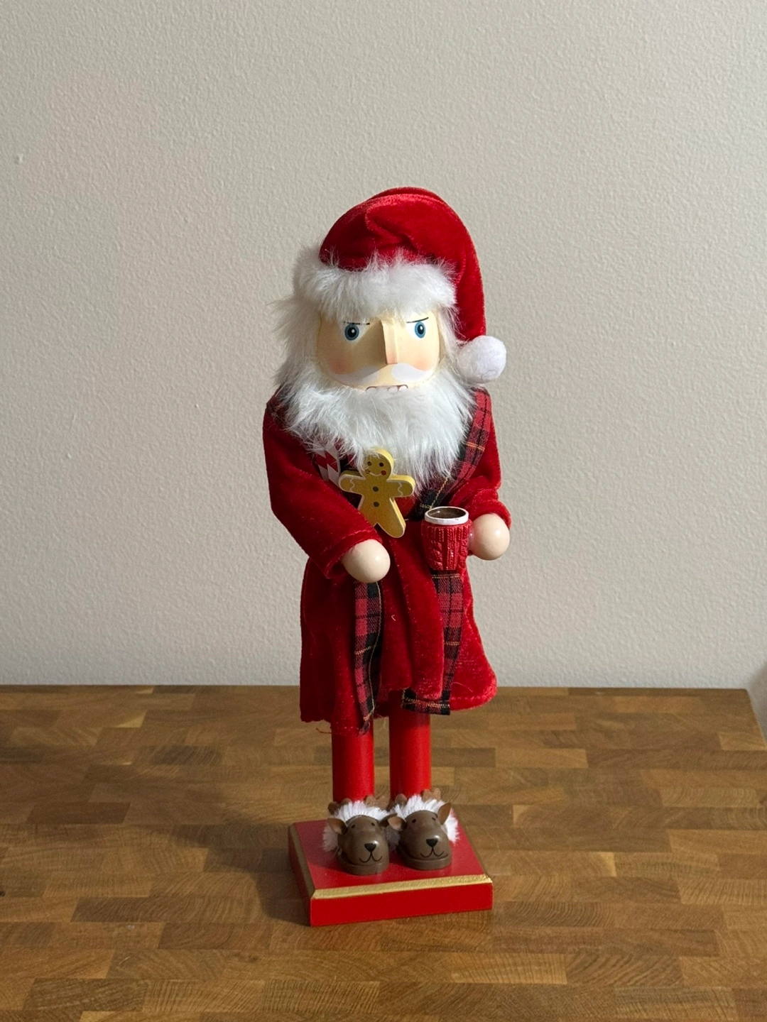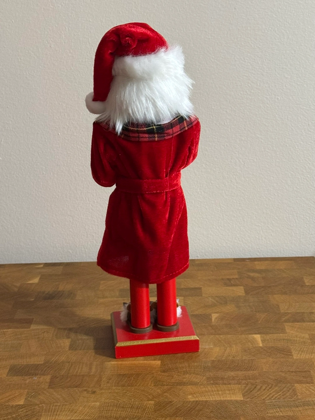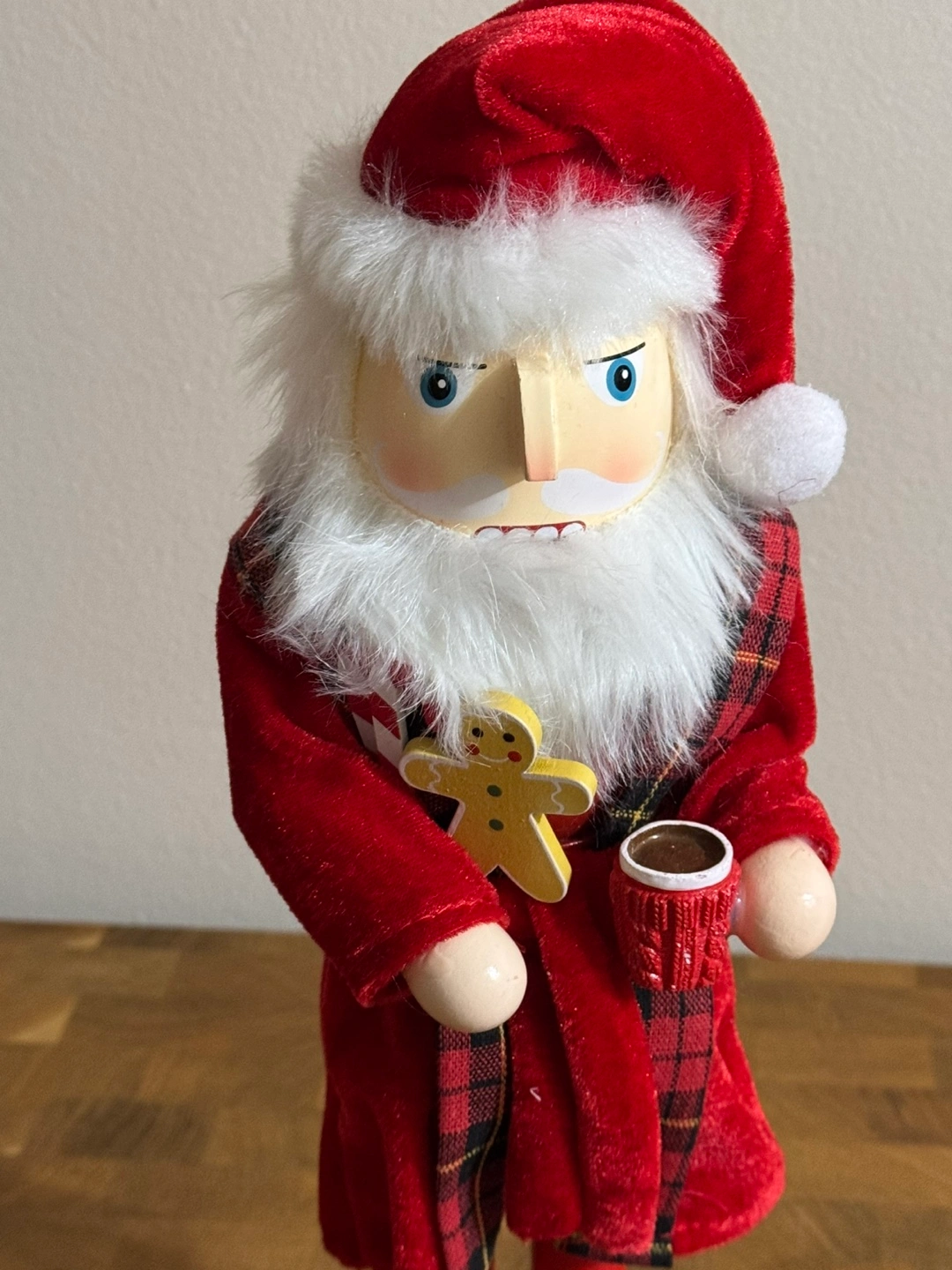 Wooden Santa nutcracker figurine. Red velvet robe, plaid trim. Holds gingerbread man and mug. Christmas decoration.