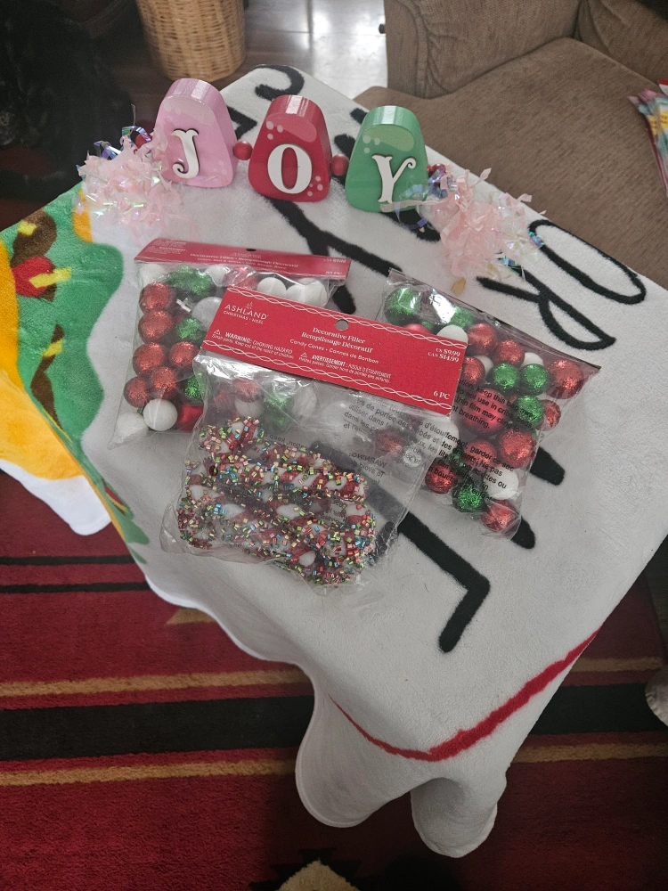 Ashland brand decorative filler, red and green glitter balls, and wooden JOY blocks. Perfect for holiday decorating.