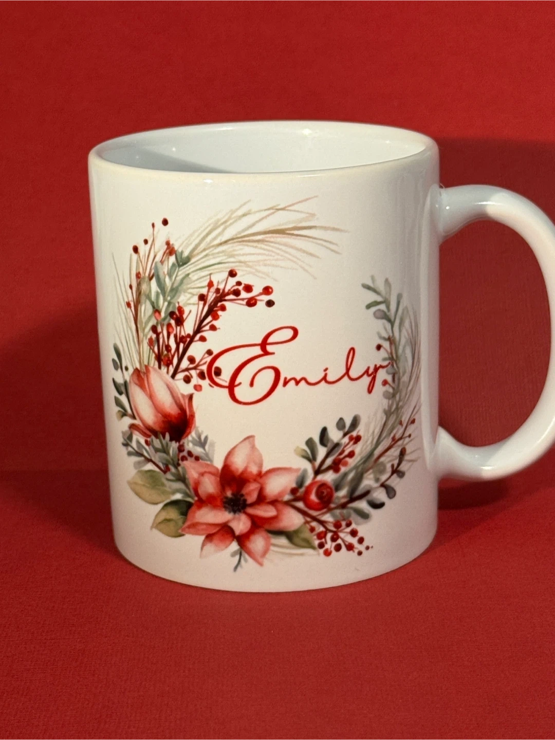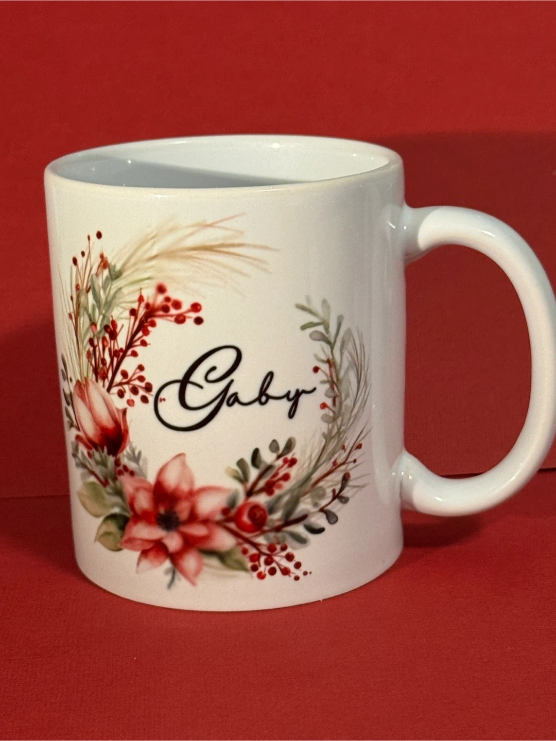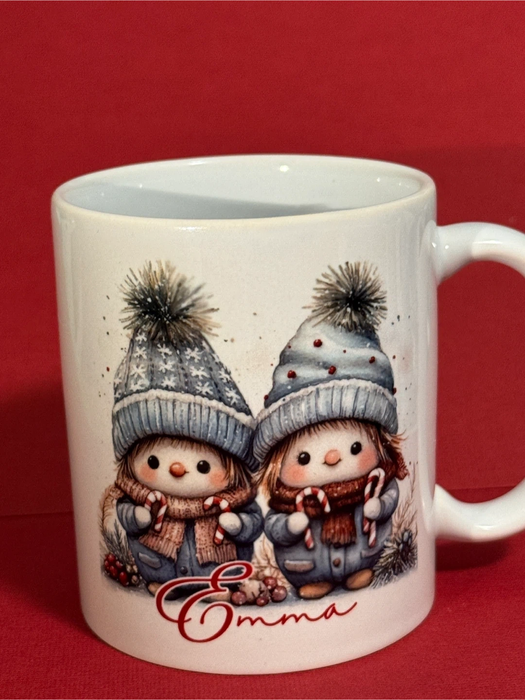 Cute festive mug! Size: 12 oz. It says "Merry Christmas" on one side, and the other side can be personalized with a name. Names in the pictures are just examples.