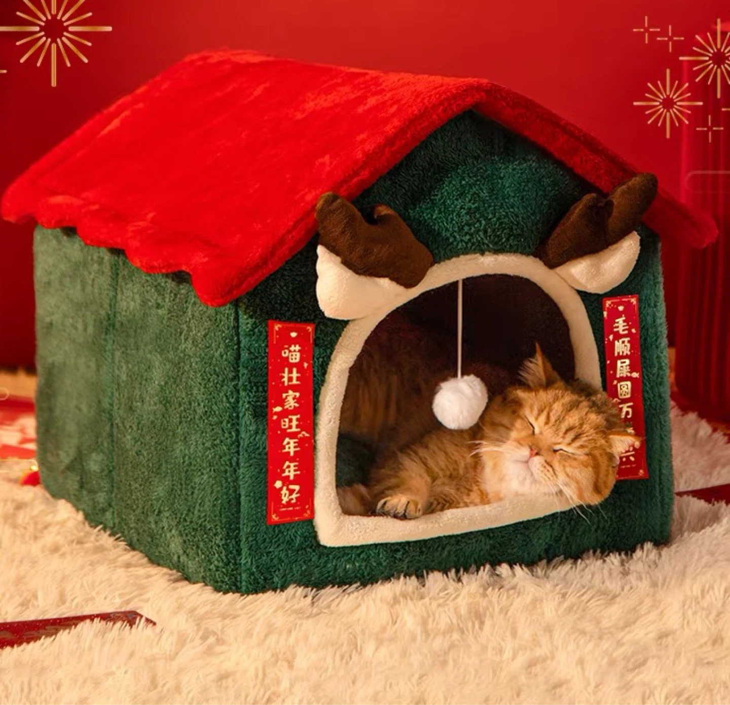 Cozy Christmas-themed pet house, perfect for cats or small dogs! It features a festive red roof, green body, and adorable reindeer antlers. Your furry friend will love snuggling up inside this cute and comfortable hideaway