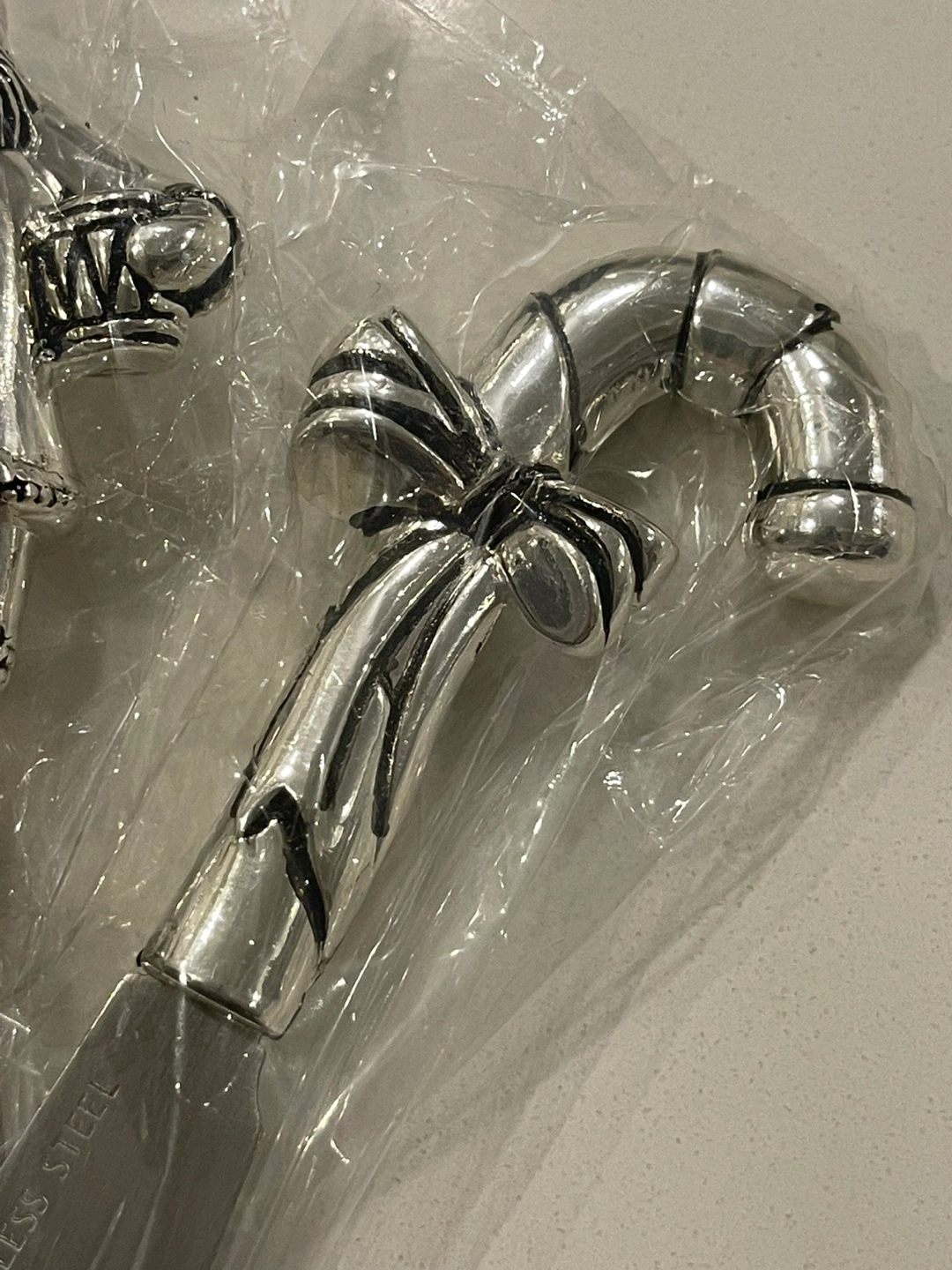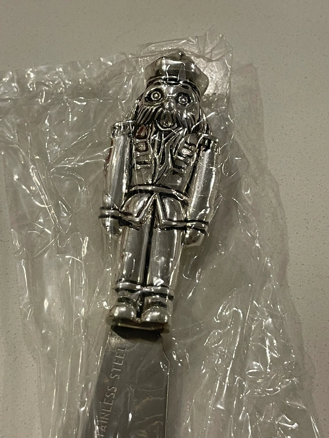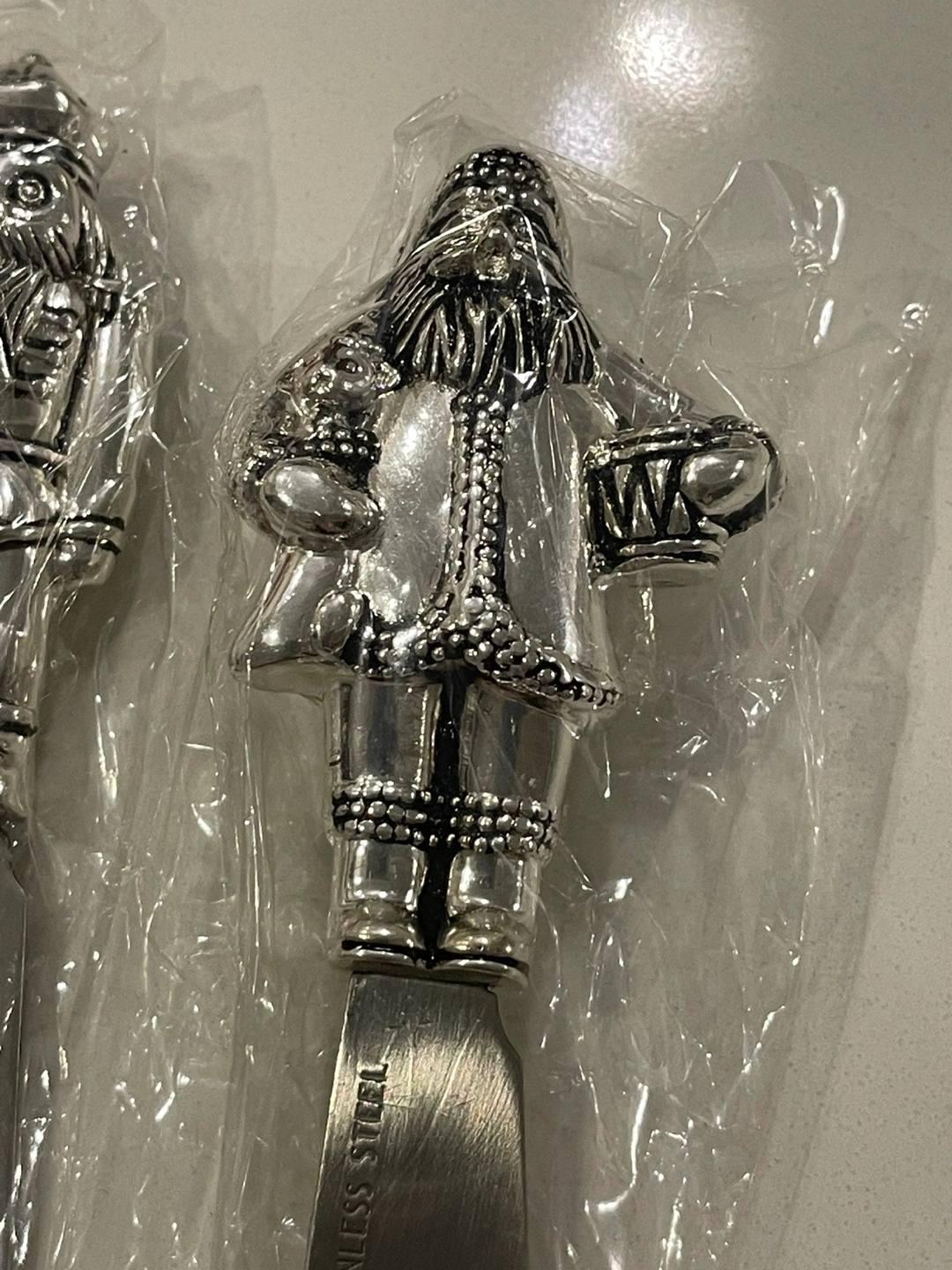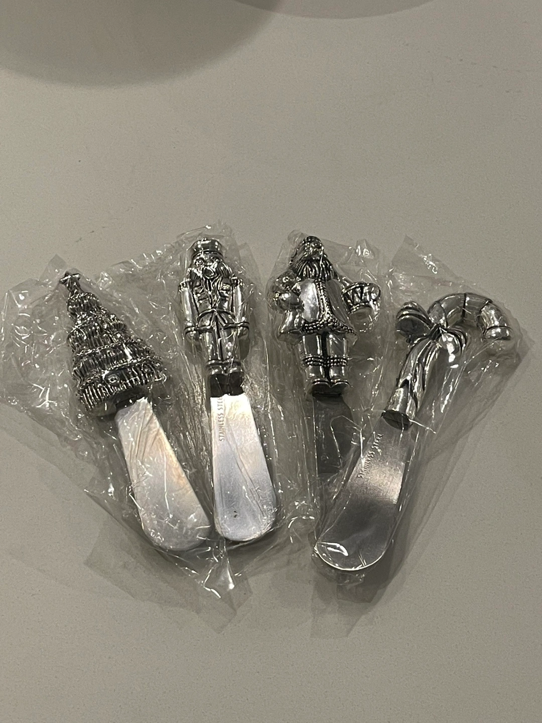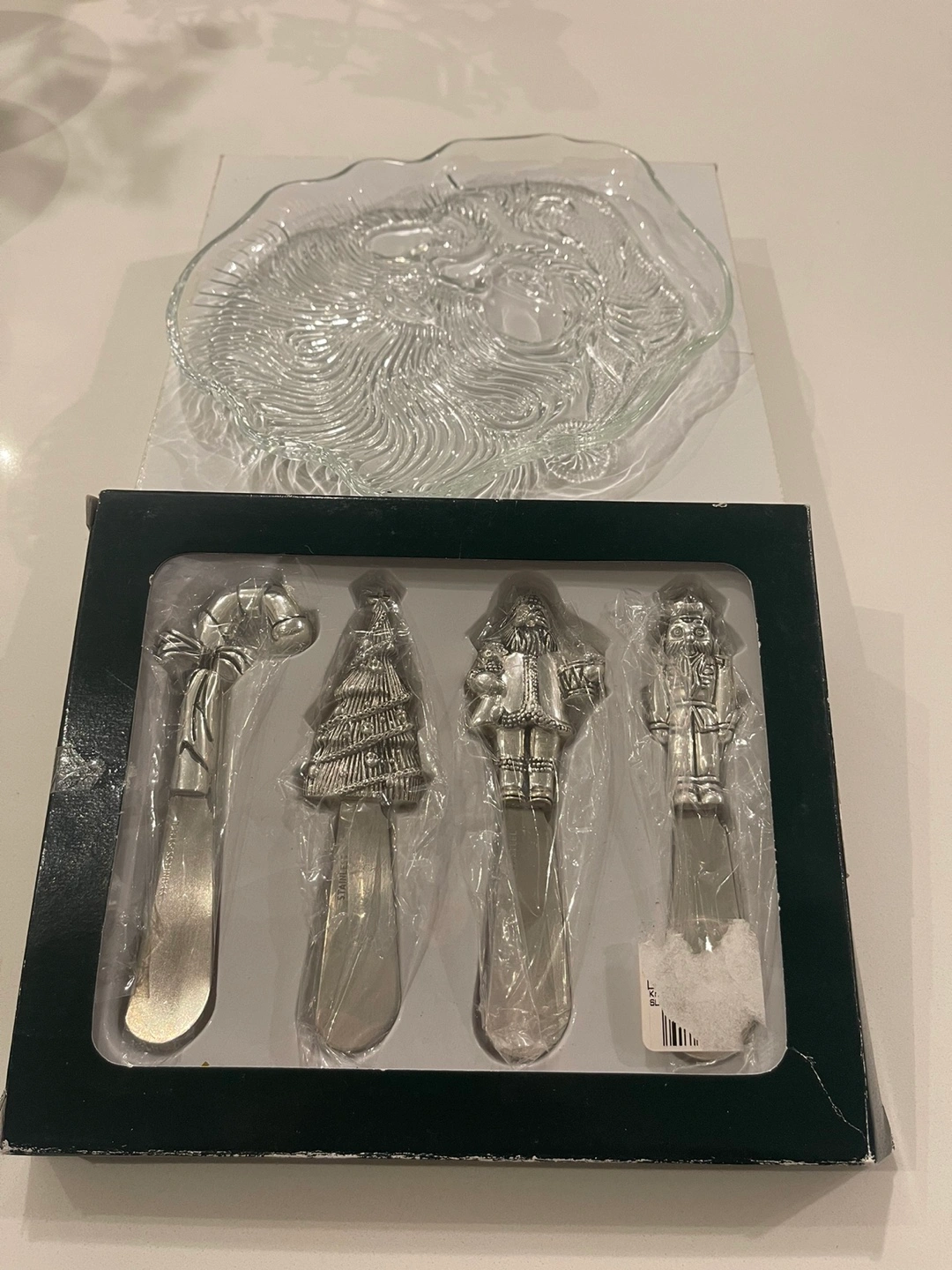 Clear glass St Nick / Santa Clause serving plate 8 1/2 inches by 7 inches. Never used comes in it’s box, no chips or scratches. 4Pc stainless steel spreader set surprisingly has some weight to it.. not flimsy! Never used . Both are great for holiday entertaining or for gift giving. Makes a great hostess gift / gift exchange . I found these same items currently for sale separately on ebay at crazy high prices for over $25 each plus shipping.Trafalgar & Dundas, Oakville.