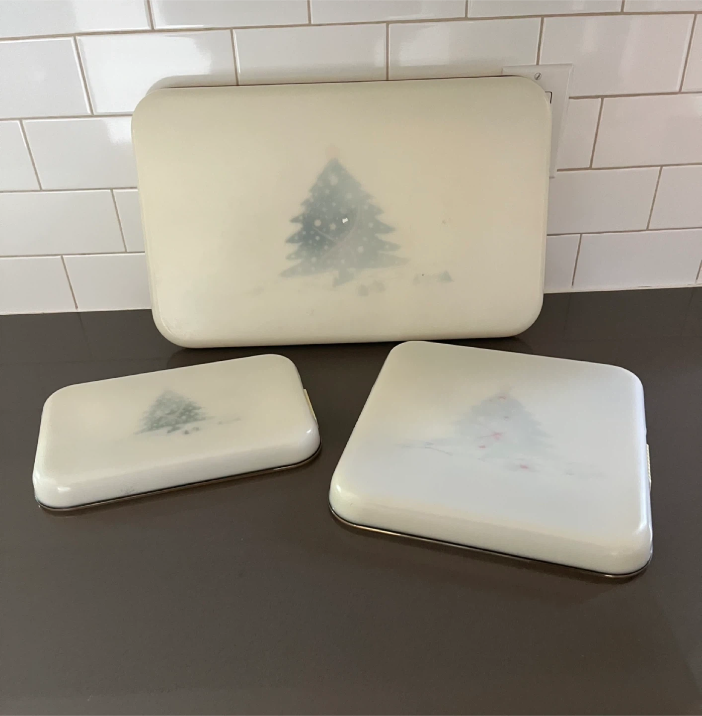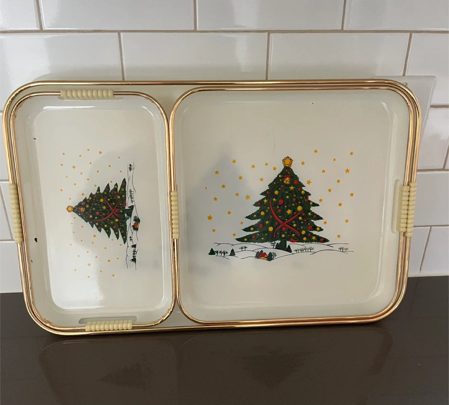Pick up in Utopia. Selling a set of vintage serving trays with a festive Christmas tree design! They have a cream-coloured base with a gold-tone trim and wicker-look handles. Perfect for holiday gatherings or adding a touch of retro charm to your home