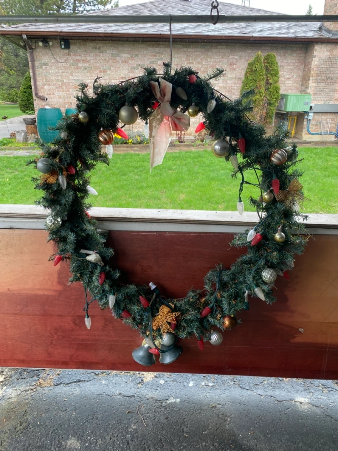 Selling a festive Christmas wreath! It's decorated with various ornaments, including silver and gold balls, red accents, and decorative bows. There are also small bells attached at the bottom. Perfect for adding a touch of holiday cheer to your home! Large Christmas Wreath with lights, pre lit very sturdy and you can customize to your own tastes $20 pick u in Prices Corners cash only