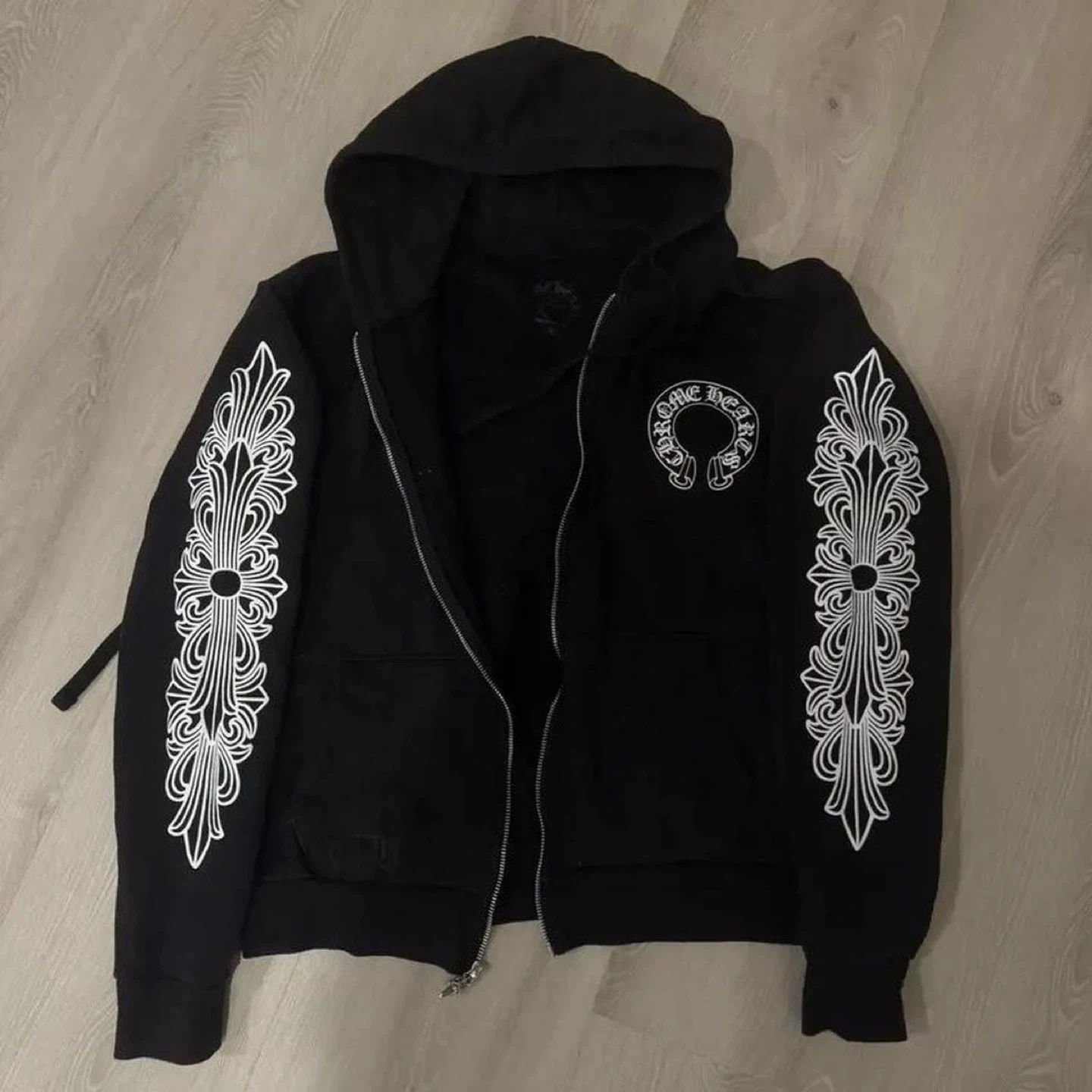 Selling a Chrome Hearts black zip-up hoodie. It features the signature Chrome Hearts cross design on the sleeves and the horseshoe logo on the chest. Great for adding a bit of edge to your wardrobe!